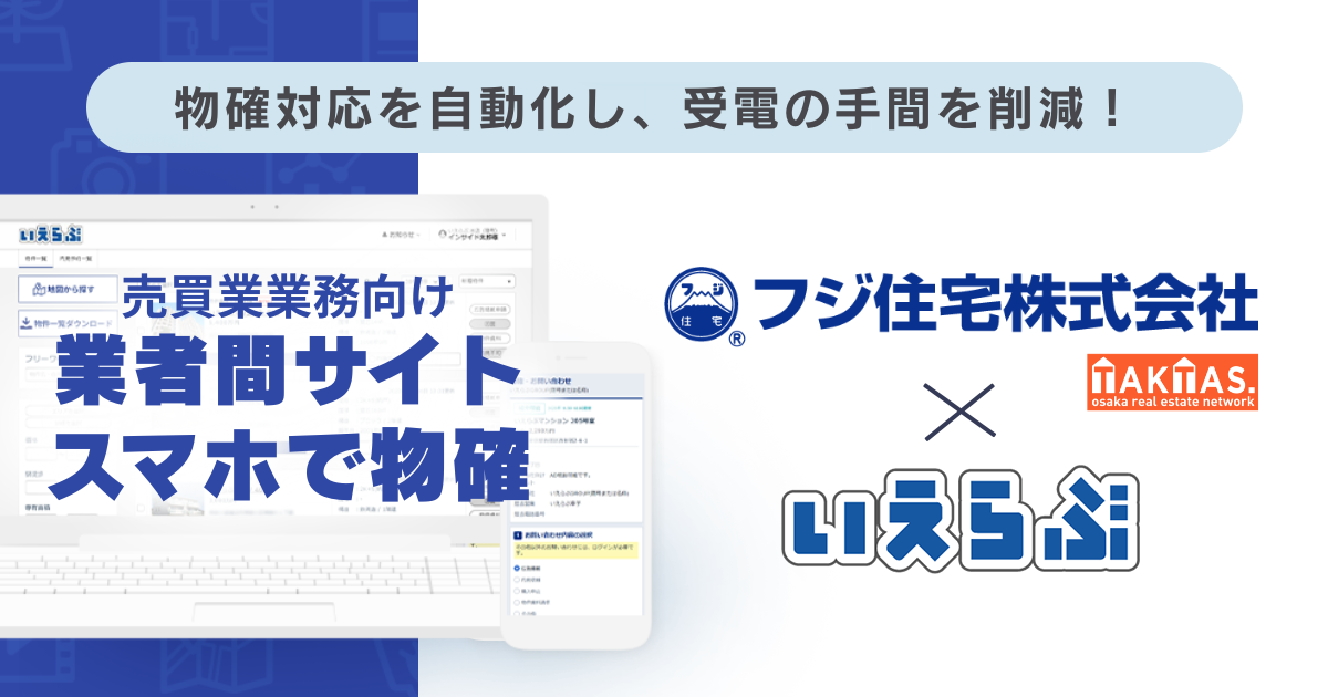 不動産業界特化のDX支援サービスを展開する、株式会社いえらぶGROUP(本社:東京都新宿区、代表取締役:岩名泰介、以下「いえらぶGROUP」)は、フジ住宅株式会社(本社:大阪府岸和田市、代表取締役社長 社長執行役員:宮脇宣綱、以下「フジ住宅」)に、売買版「業者間サイト」および「スマホで物確」の提供を開始しました。