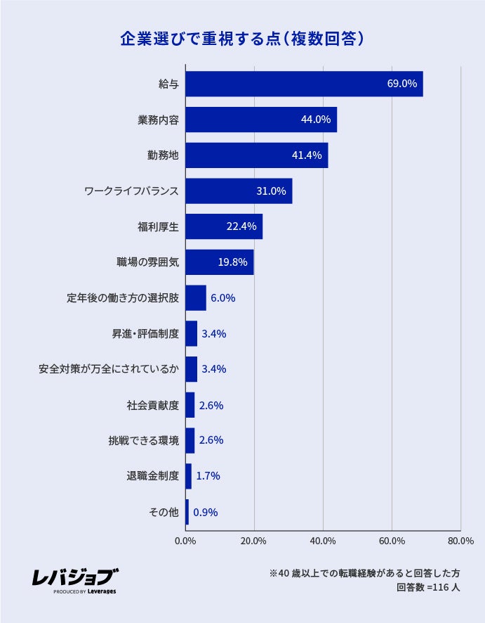 40歳以上のドライバーのうち、40歳以降での転職経験がある方に対し、企業選びで最も重視するポイントを尋ねたところ「給与(69.0%)」が最も多く、次いで「業務内容(44.0%)」「勤務地(41.4%)」と続きます。
