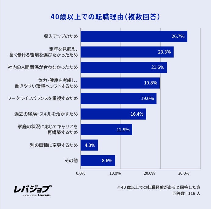 レバレジーズ株式会社が運営するエッセンシャルワーカー向けキャリア支援サービス「レバジョブ」(https://lp.levjob.jp/lp/01/1/a/00/00/00/00)は、40代以上のドライバーを対象に転職に関する実態調査を実施しました。