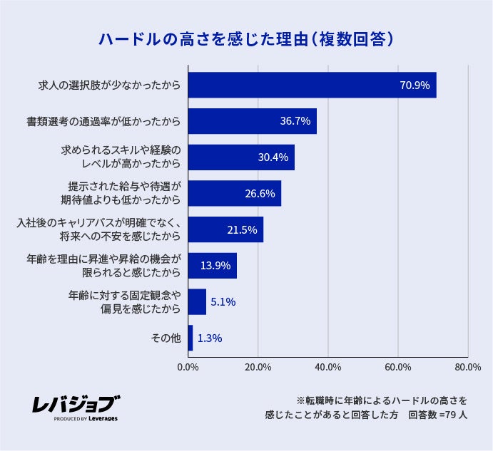 40歳以上での転職時に、年齢によるハードルの高さや制約を感じた経験がある人は約7割でした。主な理由としては「求人の選択肢が少なかった(70.9%)」や「書類選考の通過率が低かった(36.7%)」が挙げられました。