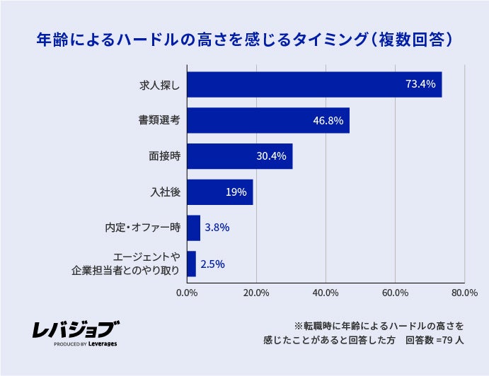 年齢によるハードルの高さや制約を感じたタイミングとしても「求人探し(73.4%)」が最も多く、次いで「書類選考(46.8%)」が続きます。
