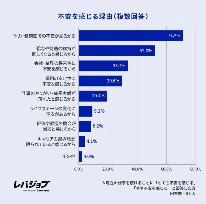 不安を感じる理由としては「体力・健康面での不安があるから(71.4%)」が最も多く、次いで「給与や待遇の維持が難しくなると感じるから(52.0%)」「会社・業界の将来性に不安を感じるから(33.7%)」が続きます。年齢を重ねることによる体力面への不安に加え、業界全体の先行きに対する不安も要素の1つとなっていることが分かります。