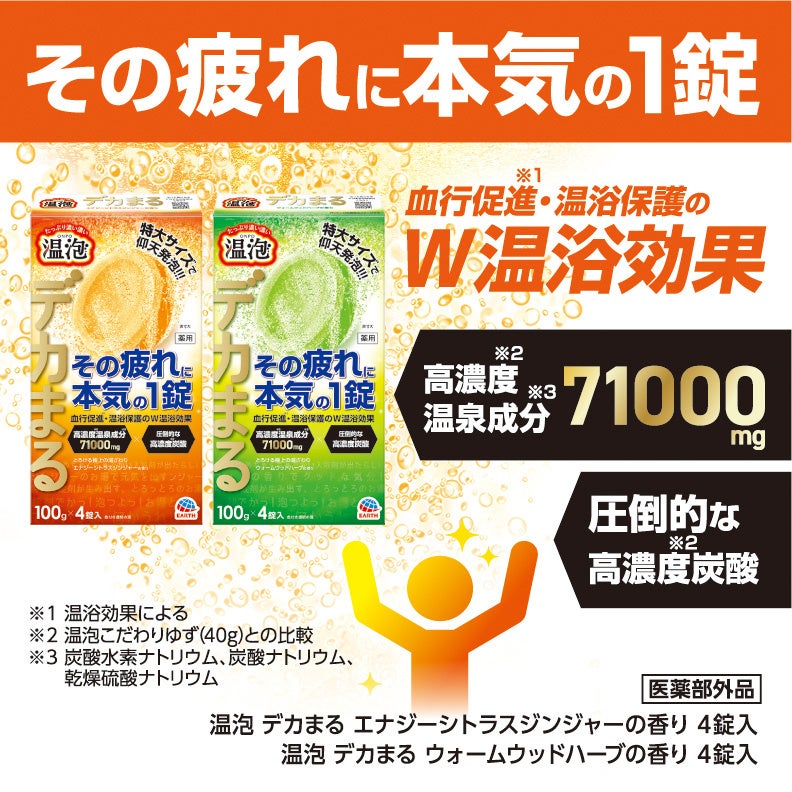 アース製薬が販売する炭酸入浴剤ブランド『温泡』シリーズの特大サイズ製品です。1錠が100gで医薬部外品最大級の大きさを誇ります。強力な発泡力が、温泉成分と炭酸を湯に溶かします。たまった疲れをしっかりと取りたい方にお勧めの製品です。