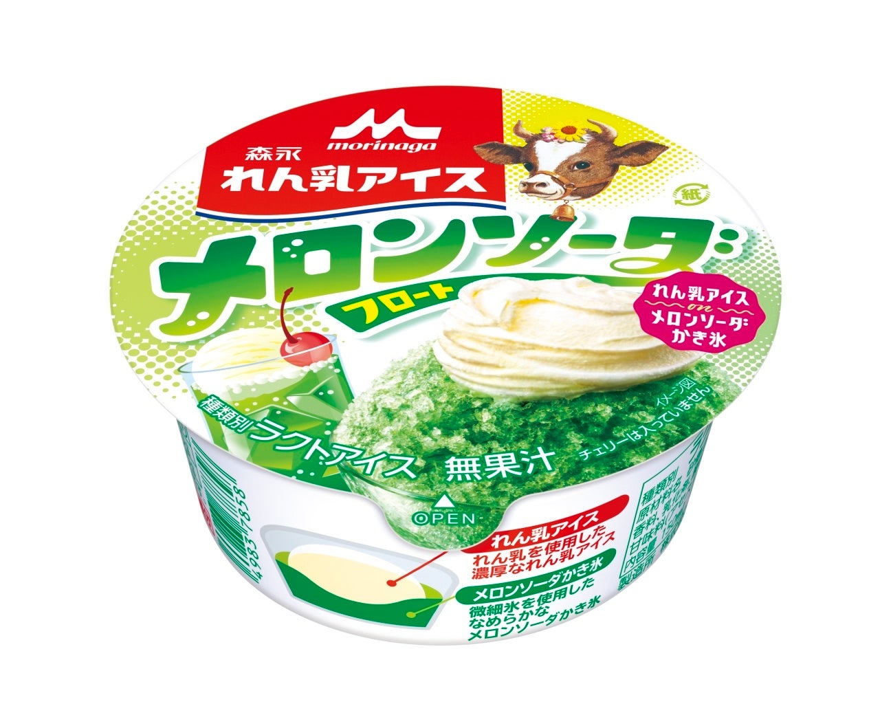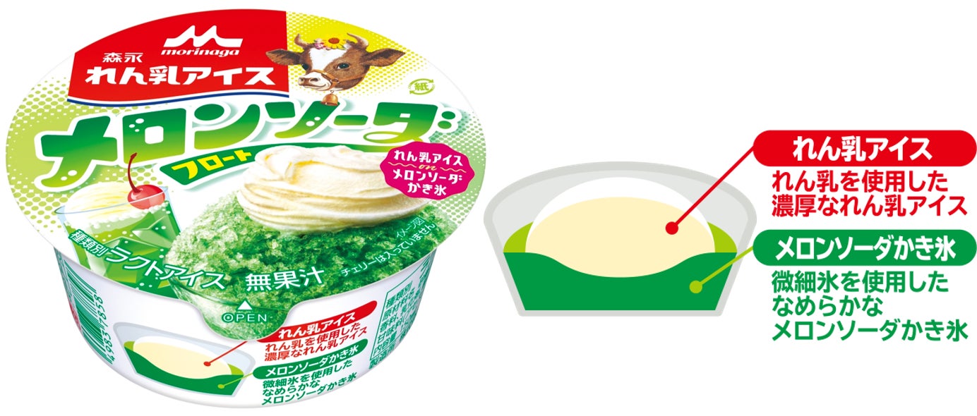 新商品は、すっきりとした爽快感のあるメロンソーダのかき氷の上に、「森永ミルク 加糖れん乳」を使用した濃厚なれん乳アイスをドーム状に乗せた氷菓カップアイスです。