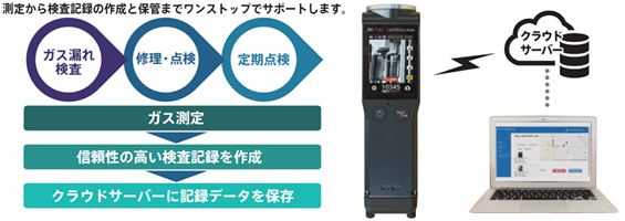 本製品は、従来品の「レーザーメタンミニ」を改良し、新たにデジタルカメラを搭載することで漏洩箇所の画像とその時の測定値、時刻情報をワンセットで記録します(特許出願中)。また、記録した検査記録を専用のアプリを使いクラウドサーバーに収めることで、ガス漏れ検査から検査記録の作成、保管までワンストップでサポートします。