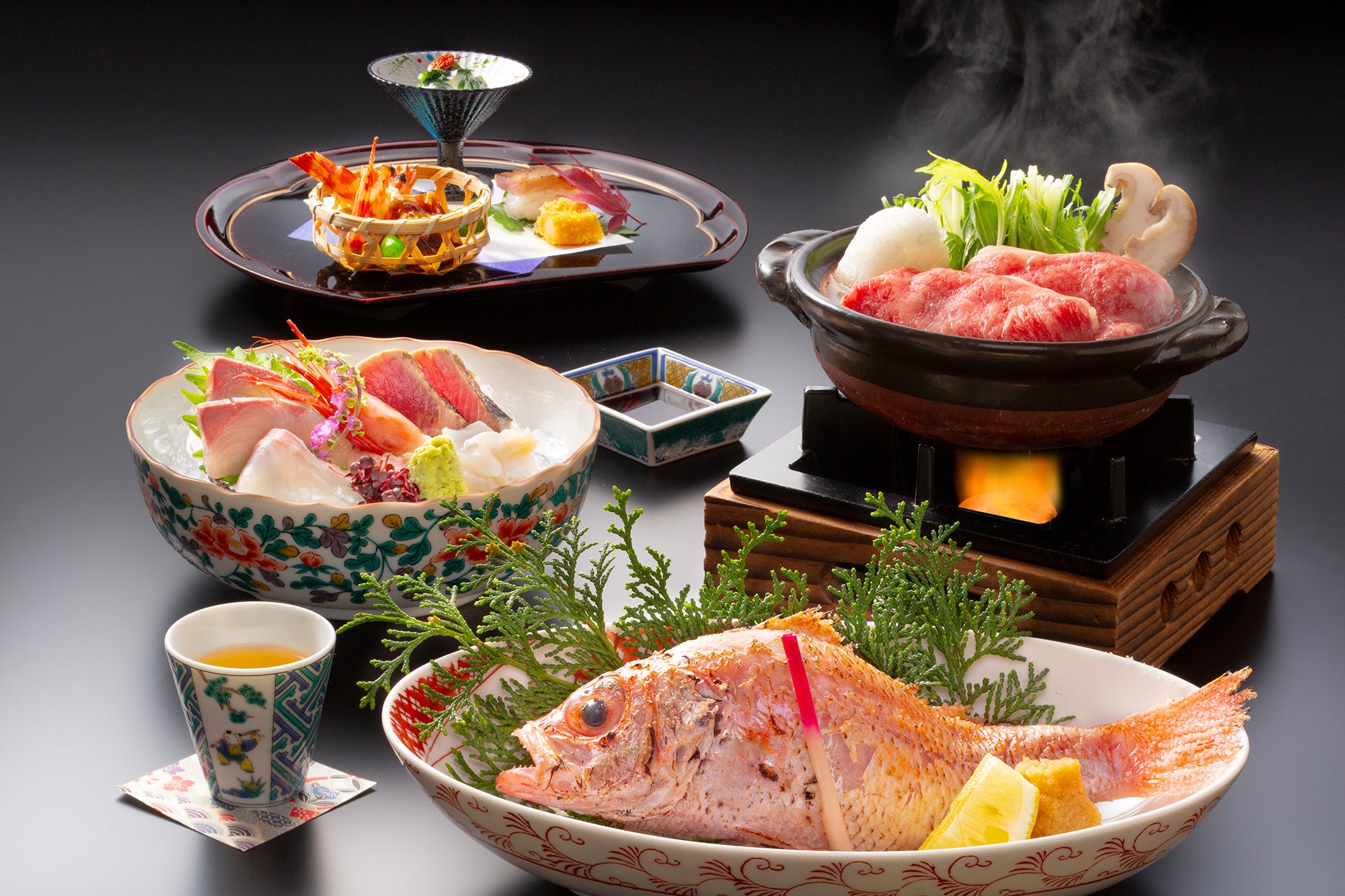 ズワイ蟹、のどぐろ、輪島ふぐ、甘海老ほか日本海の海幸、能登牛、加賀野菜、鴨の治部煮など加賀百万石の郷土料理は、加賀会席と本格的な鉄板焼でご賞味ください。