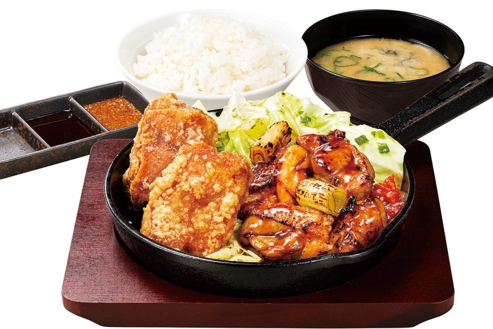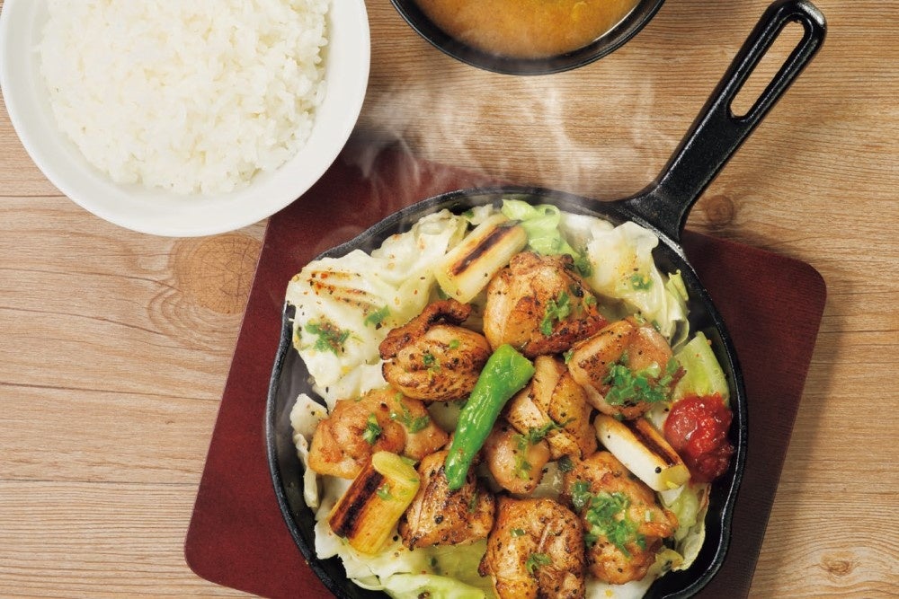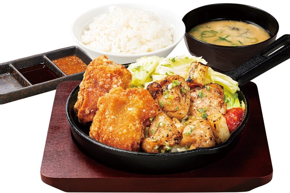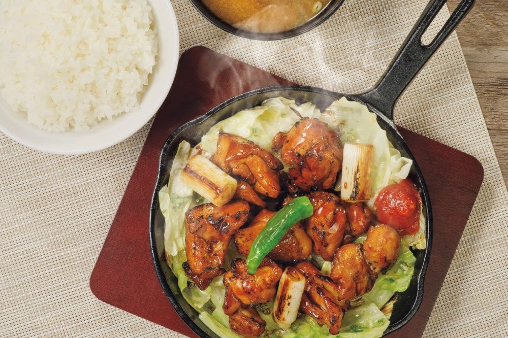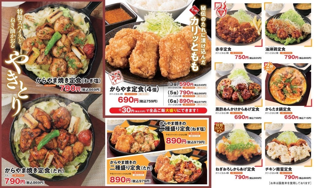 今回の新グランドメニューでは、とことん「カリッともも」をお楽しみいただける11種類の定食に加え、期間限定メニューでも大変ご好評いただいている"鉄板シリーズ"として提供する「からやま焼き」が新しく仲間入りいたします。