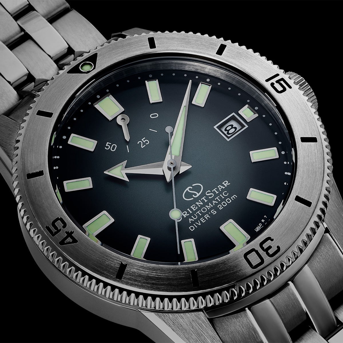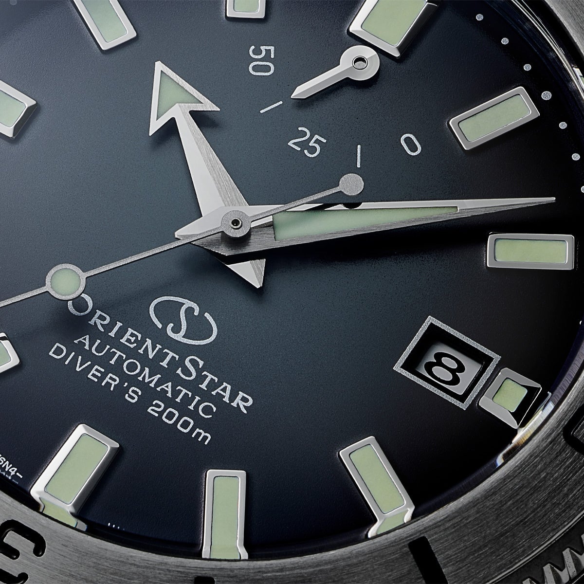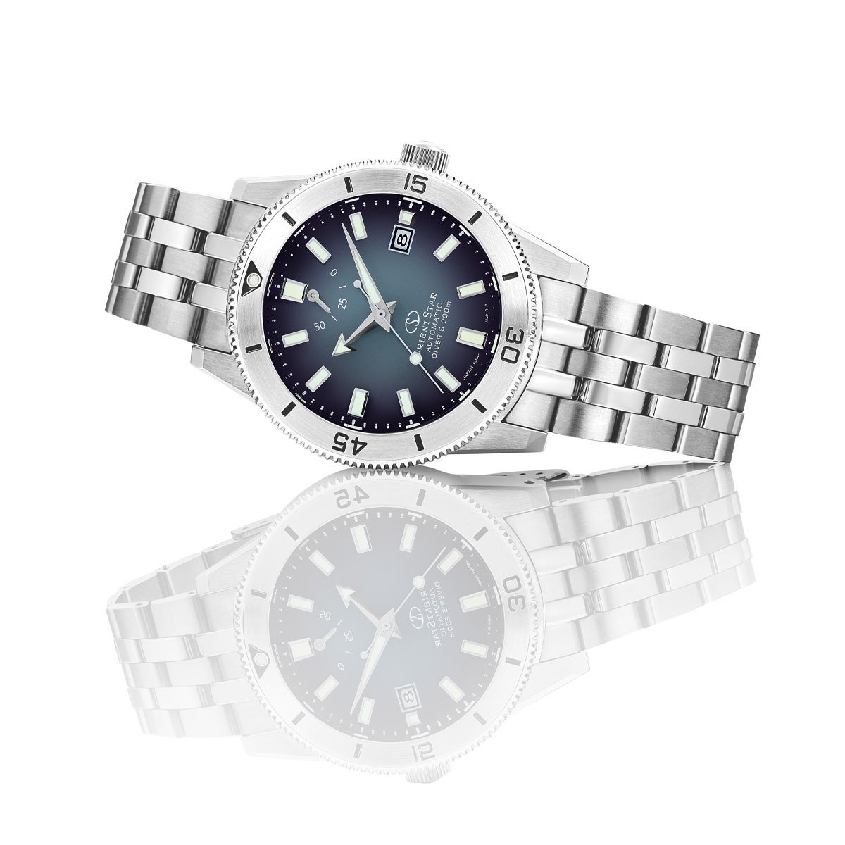 そのオリエントスターの75周年を記念するモデルは、ブランドにとって永遠のテーマである夜空の星と、ダイバーモデルの長い歴史をともに象徴する特別なデザインが文字板に表現されています。イメージは「夜空と深海」。夜空に輝く星の輝きを受けて変化する海面の表情を表現した文字板は、中心のブルーグレーから外周に向けてブラックへと変化するグラデーション加工が施され、濃淡の変化はまた、海面から深海へと続く世界をも連想させます。