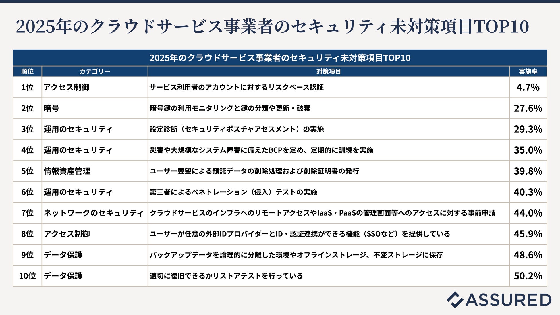 Assuredクラウド評価が実施するセキュリティ評価の項目のなかで、実施率の低い対策上位10項目は以下となりました。
