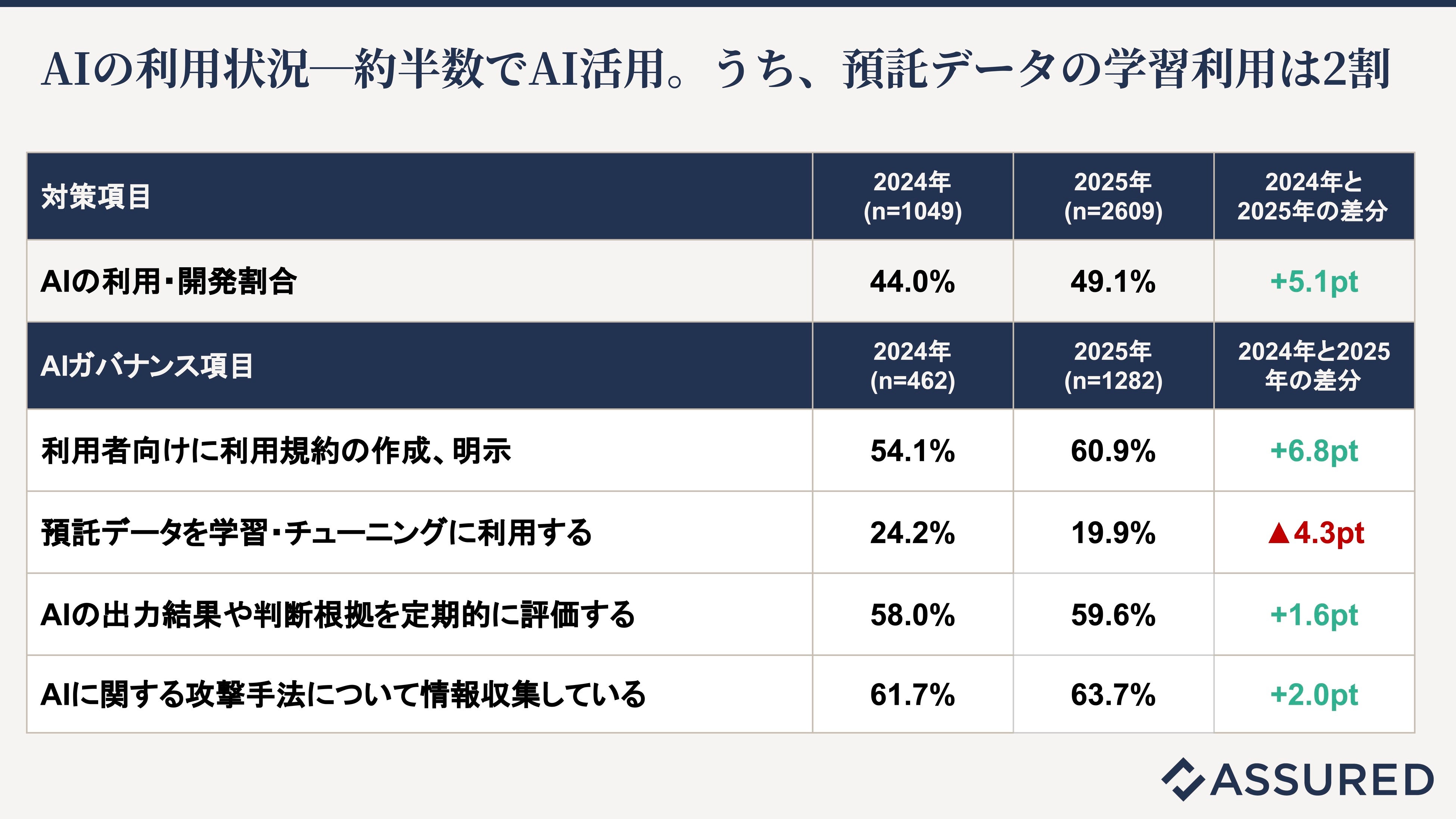 SaaS提供におけるAIの利用・開発割合は49.1%となり、約半数のサービスでAI活用が進んでいます。AIガバナンスに関しては、「利用者向け利用規約の作成・明示」が60.9%(前年比+6.8pt)と進展が見られます。また、利用企業が特に懸念する「預託データをAIの学習・チューニングに利用する」割合は、AI利用サービス全体の19.9%(前年比▲4.3pt)に減少しました。これはSaaS全体で見ると約1割に相当します。