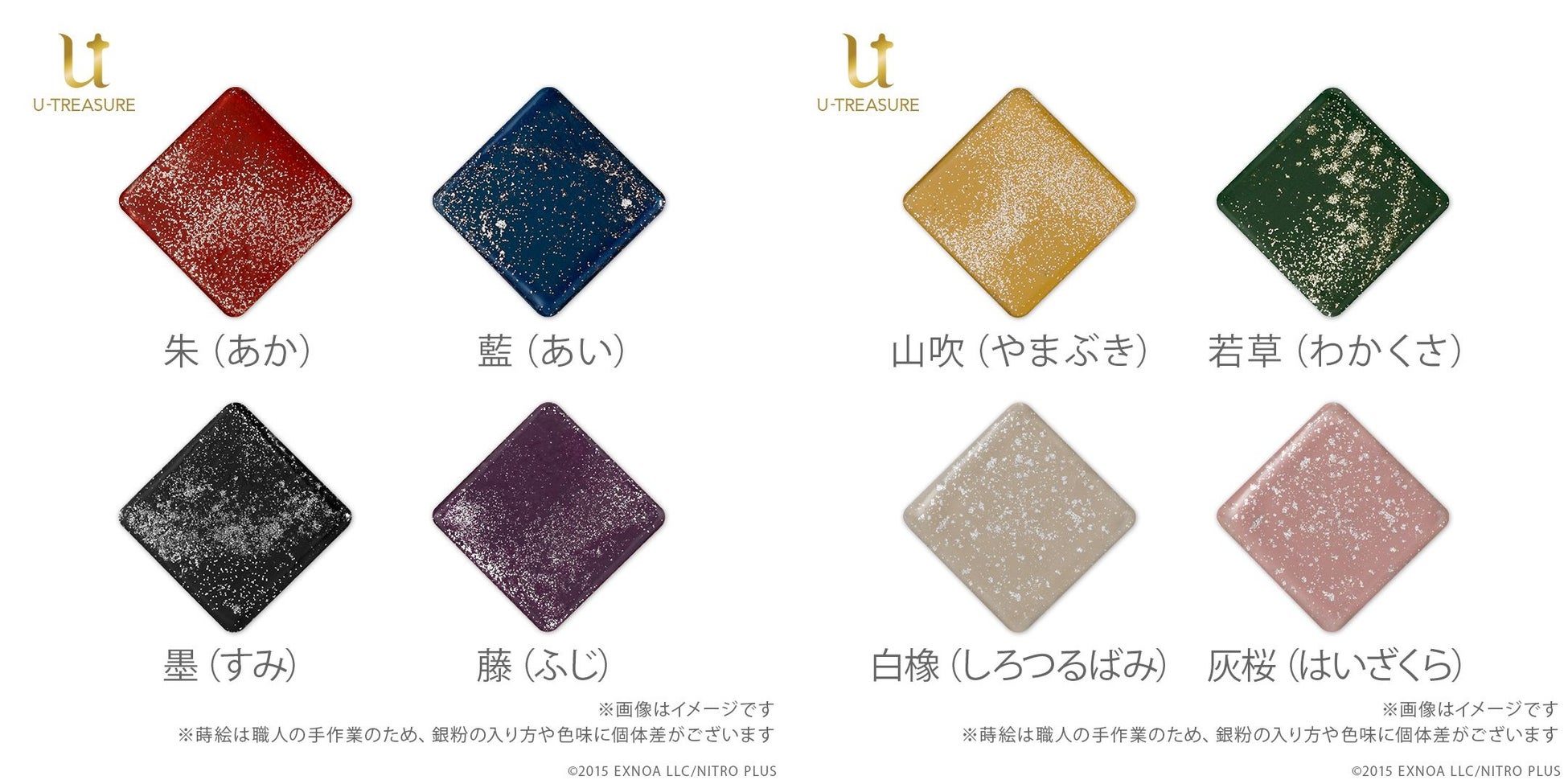 朱(あか) 藍(あい) 墨(すみ) 藤(ふじ) 山吹(やまぶき) 若草(わかくさ) 白橡(しろつるばみ) ←新色 灰桜(はいざくら) ←新色 |