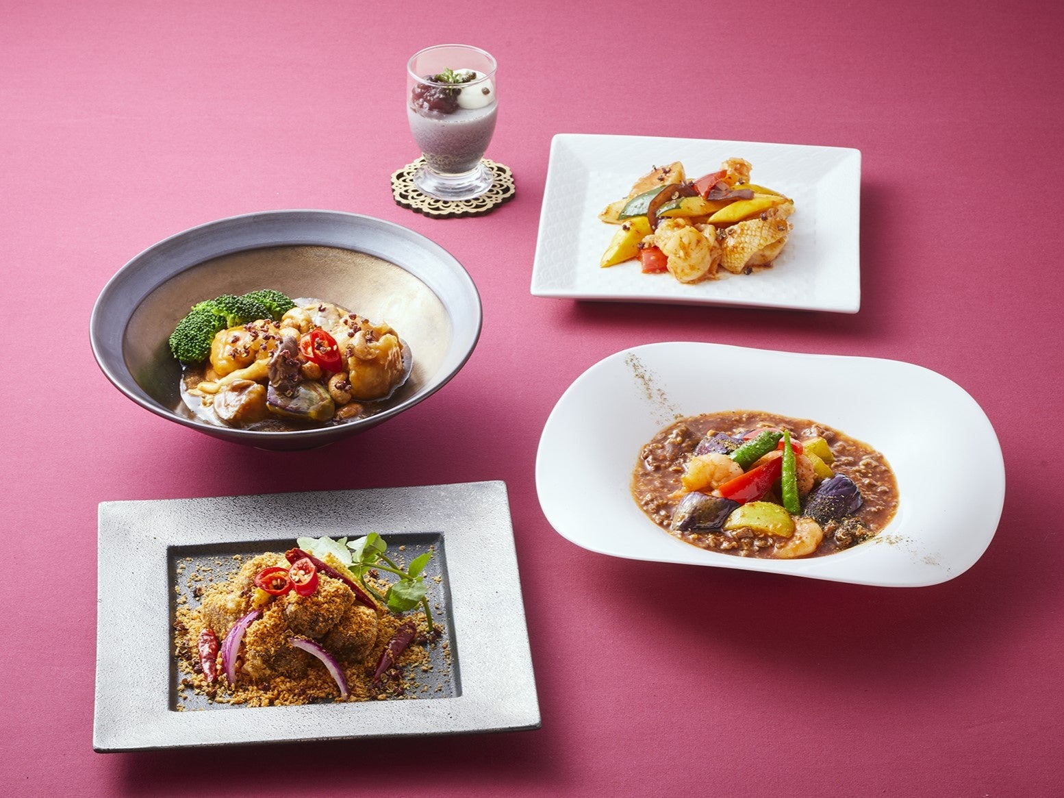 海老と冬瓜の麻辣醤煮込みは、花椒の痺れるような辛味と、海老のプリっとした食感や冬瓜のとろりとした食感をお楽しみいただける一品です。また、強火で火入れして素材の旨みを引き出しながら辛味をきかせた、アオリイカと大海老 帆立貝の麻辣醤炒めや、黒胡麻のコクと鼻に抜ける山椒の香りとの一体感をお楽しみいただける、黒胡麻プリンをご用意いたします。スパイスの香りと辛味を存分にご堪能いただける、趣向を凝らした一品料理をぜひこの機会にご賞味ください。
