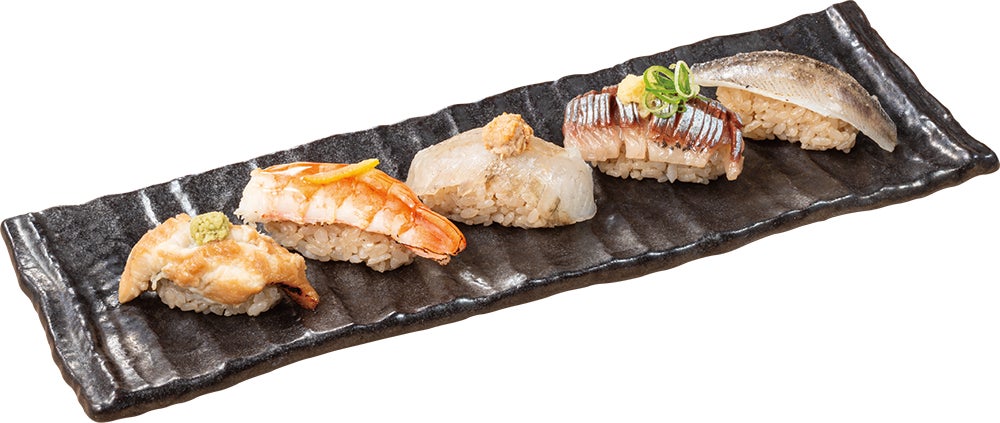 今回の目玉商品は、素材にこだわり手間暇をかけた「杉玉の真っ向5貫盛り」です。口に入れた瞬間にふわっととろける煮穴子、ネタの裏に酢を塗って炙ることで甘みを引き立たせた海老、濃厚なあん肝と相性抜群の昆布〆平目、脂のりの良い北海道産とろにしん、質の良い脂で上品な甘みが特長のメヒカリを一皿で堪能できる贅沢な一皿です。