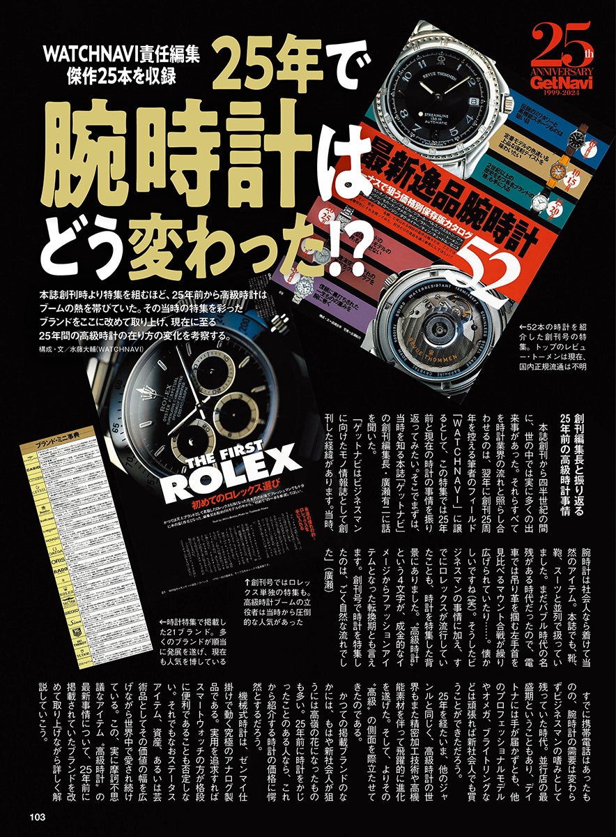 GetNaviの兄弟メディアである腕時計専門誌「WATCHNAVI」が責任編集。GetNav創刊i25周年イヤーを記念し、本誌の創刊当時に特集を彩ったブランドをここで改めて取り上げ、25年間の高級時計の在り方の変化を考察する。