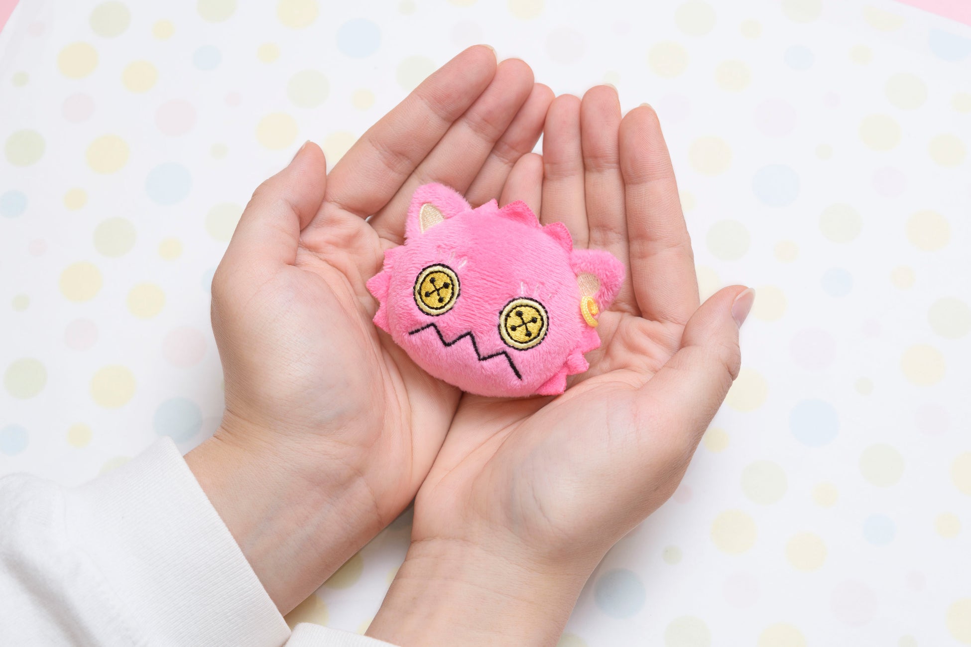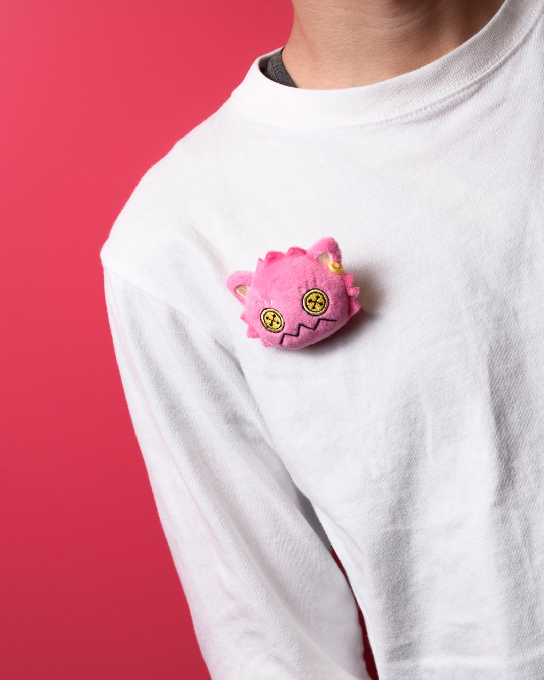 『カリバディクス』のキャラクター「がおっきー」の手のひらサイズのぬいぐるみバッジ。