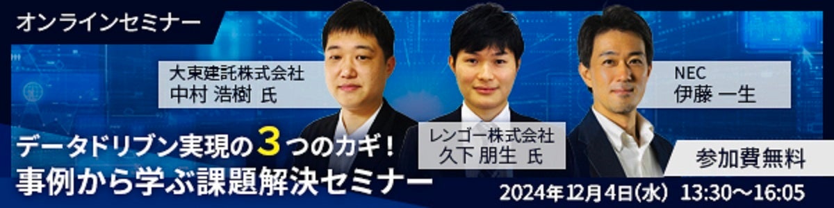 NECは、2024年12月4日にオンラインセミナー「データドリブン実現の3つのカギ!事例から学ぶ課題解決セミナー」の再放送をします。(本セミナーのライブ配信は2024年7月19日)
