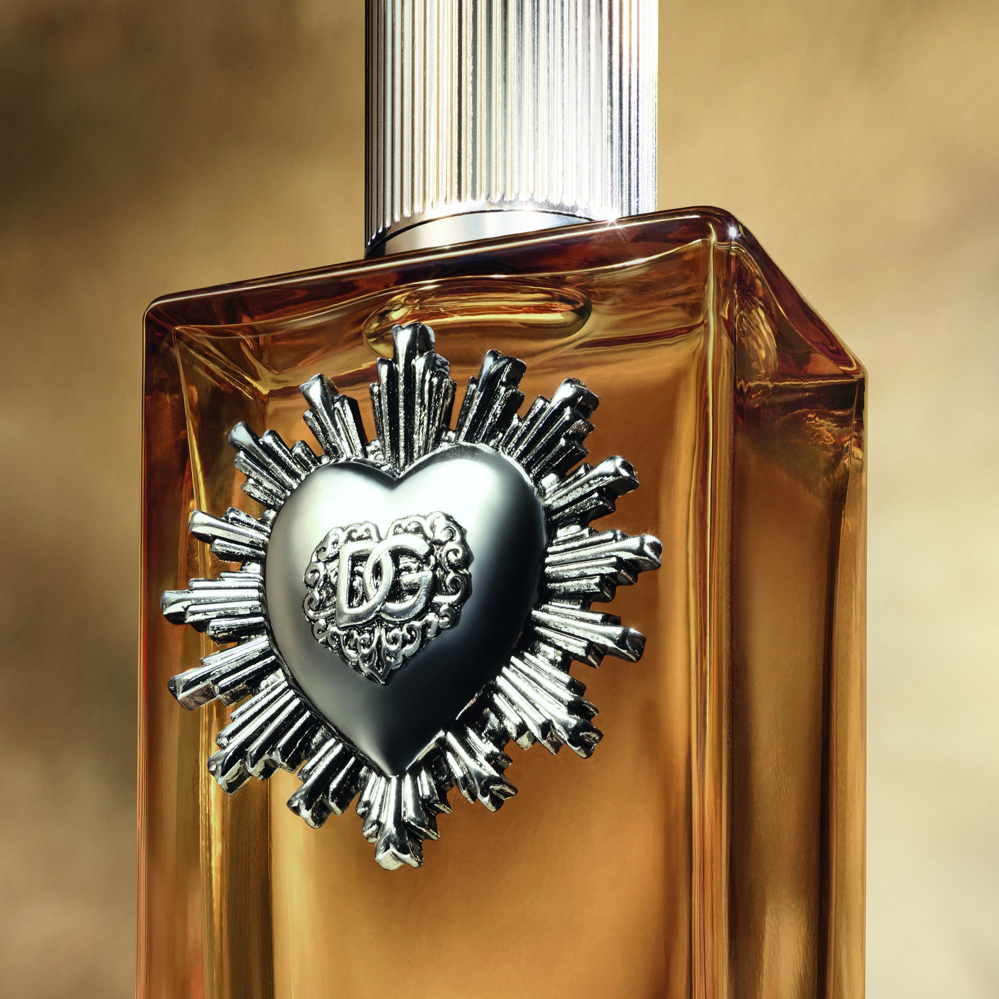 ディヴォーション プールオムのアンバートーンのガラスボトルに輝く、シルバーのサクレハートとキャップ。優美なダークグレーの外箱にもシルバーの箔押し加工が施され、ドルチェ&ガッバーナのDNAに息づく、時代を超越した洗練さとクラフツマンシップへのこだわりが光ります。