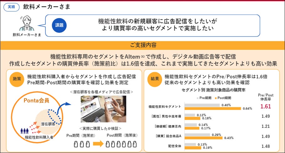 実証実験として機能性飲料の新規顧客獲得に向けたデジタル広告配信を行ったところ、潜在顧客スコアの高スコア者ターゲットにおいて、施策前期間と比較した購買率が約160%となりました。競合商品の実購買に基づくターゲット(購買率約150%)よりも高い結果が得られました。
