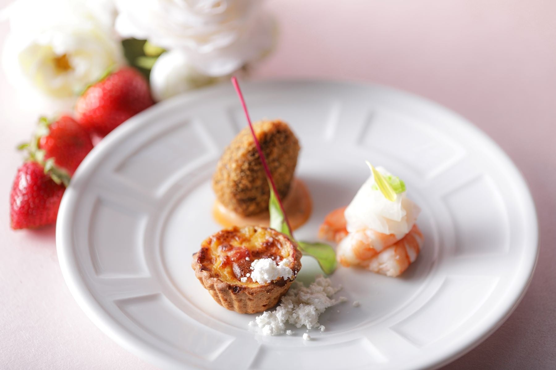 ・セイボリー:シェフ特製3種のセイボリー(海老と今市蕪のマリネ/アランチーニ/本日のキッシュ)