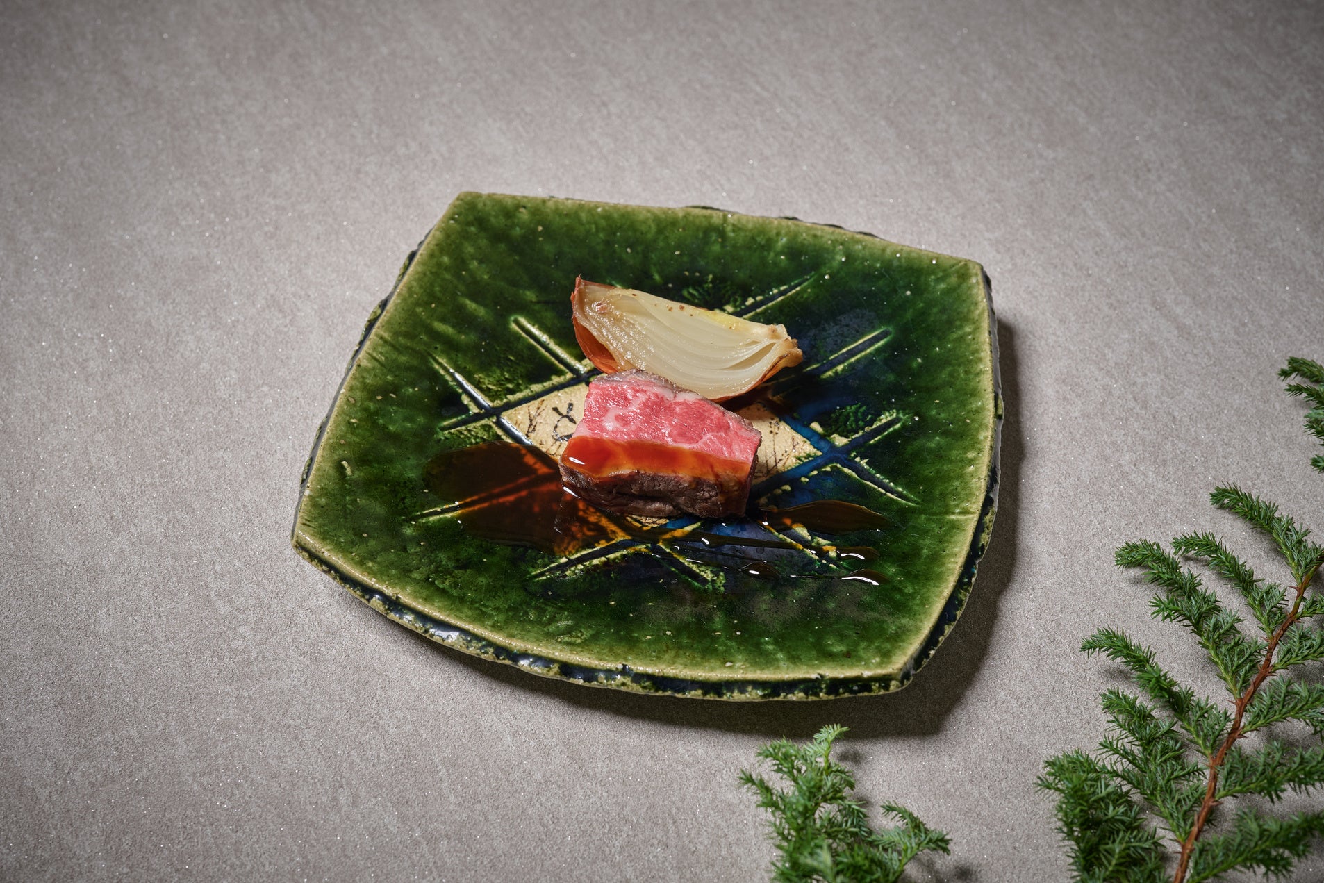 冬の寒さに耐え甘みが増した玉葱を、素材そのままの味わいを生かすため皮付きのままグリルに。牛ヒレ肉の旨味が、玉葱の自然な甘さと寄り添い、豊かなマリアージュを生み出します。ソースはあえてシンプルに仕立て、古野農場のお米からつくられた純米酢と黒味醂を使用することで、澄んだ酸味と奥行きを添えました。