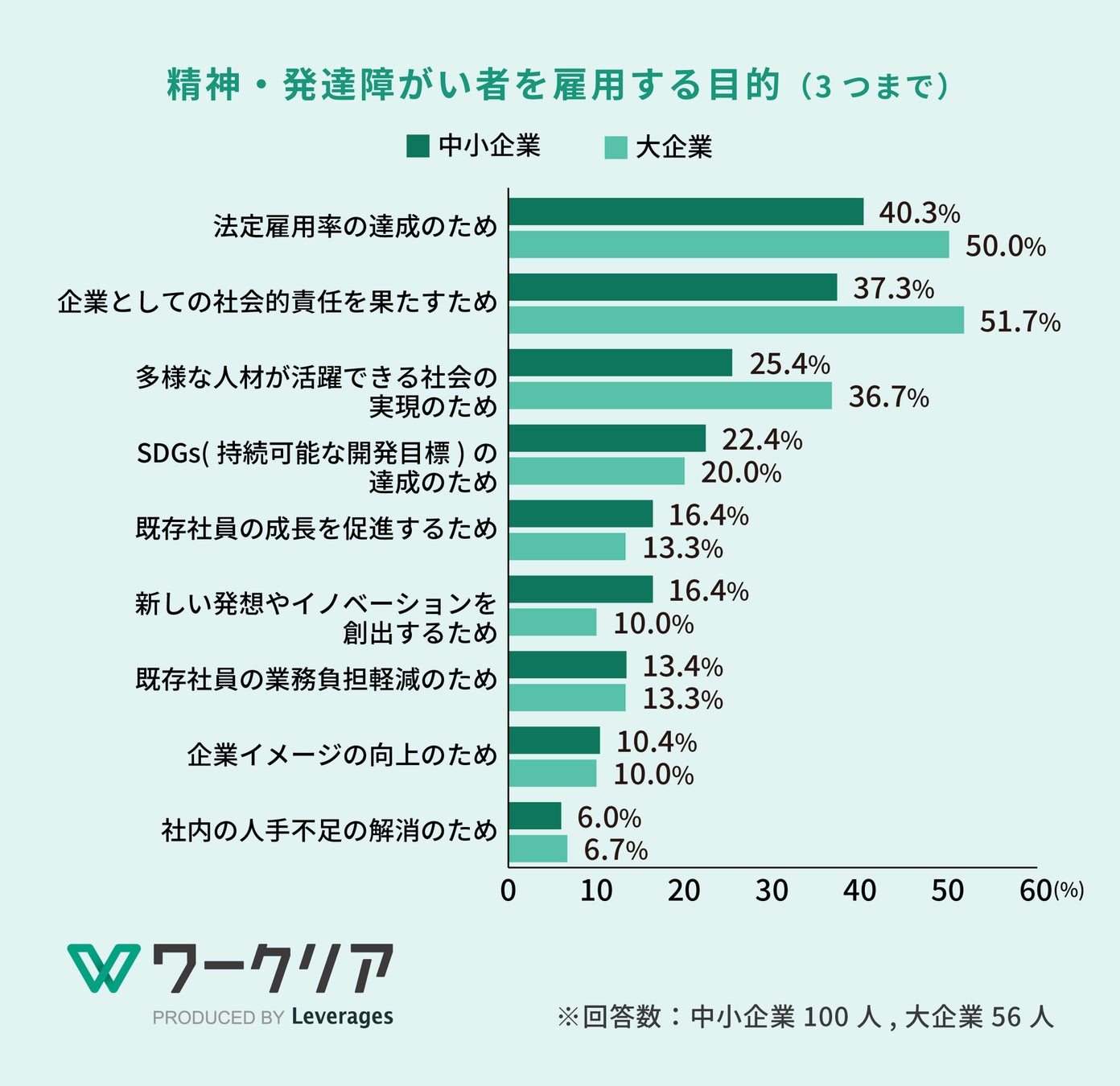 精神・発達障がい者を雇用する目的は、「企業としての社会的責任を果たすため(47.4%)」や「法定雇用率達成のため(38.5%)」、「多様な人材が活躍できる社会の実現のため(30.8%)」が上位を占めました。