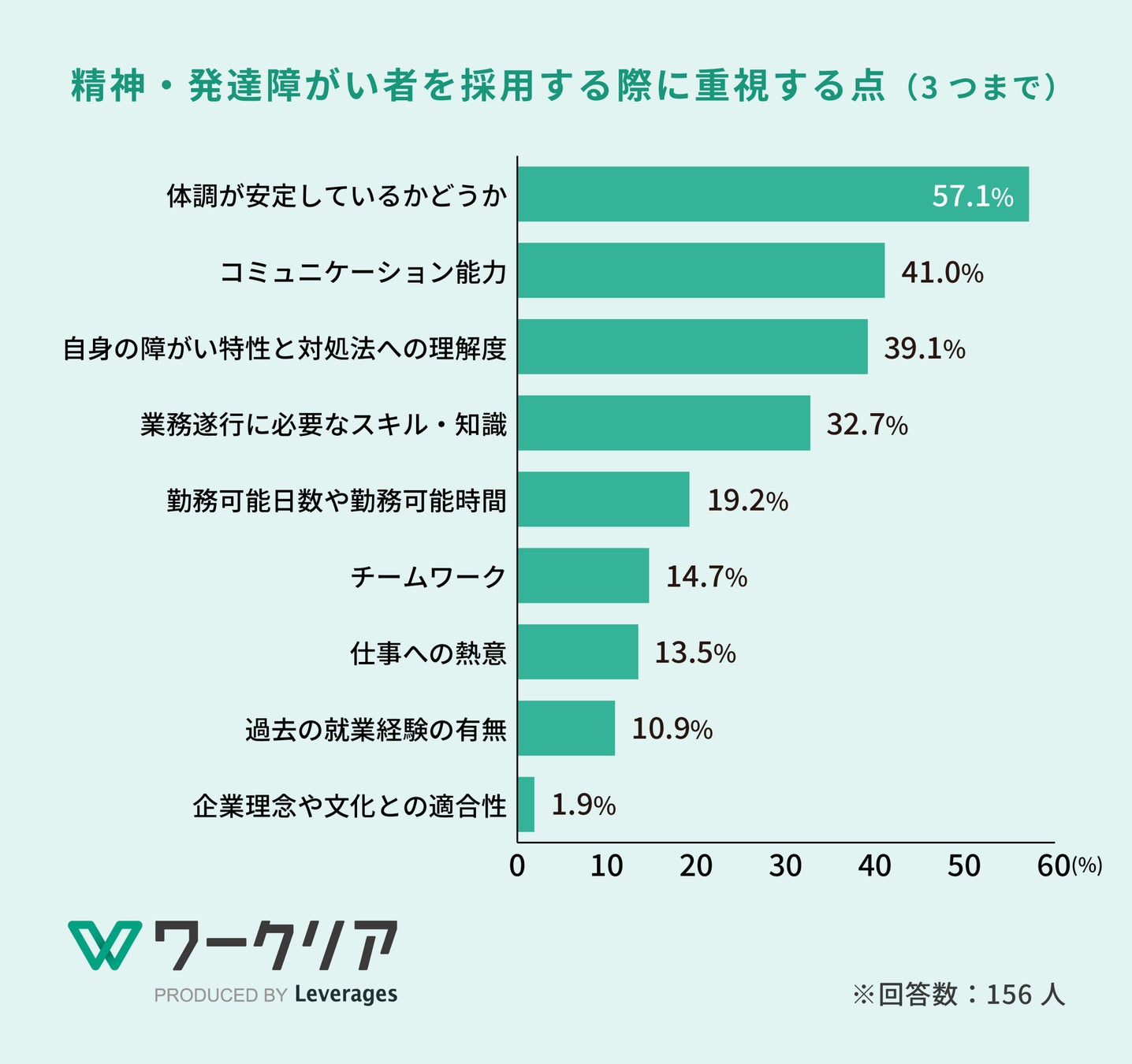 精神・発達障がい者を採用する際に重視するポイントでは、「体調が安定しているかどうか(57.1%)」が最も多く、次いで「コミュニケーション能力(41.0%)」「自身の障がい特性とその対処法への理解度(39.1%)」と続きました。