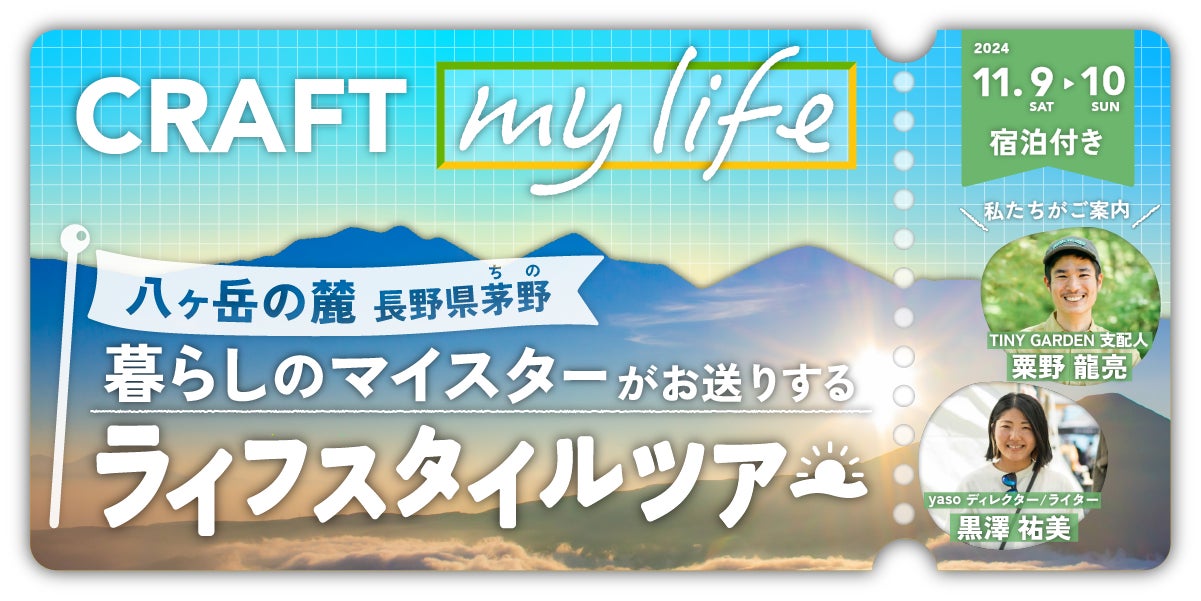 株式会社カヤック(本社:神奈川県鎌倉市、代表取締役CEO:柳澤大輔、東証グロース:3904、以下「カヤック」)と東急不動産株式会社(本社:東京都渋谷区、代表取締役社長:星野 浩明、以下「東急不動産」)は、20代〜30代の生き方や働き方を模索する若年層に、八ヶ岳の麓・長野県茅野市の豊かな自然を活かした暮らしを体験してもらおうと、2024年11月9日(土)・10日(日)に1泊2日で「CRAFT my life 〜八ヶ岳の麓 茅野〜 暮らしのマイスターが送るライフスタイルツアー」を開催します。