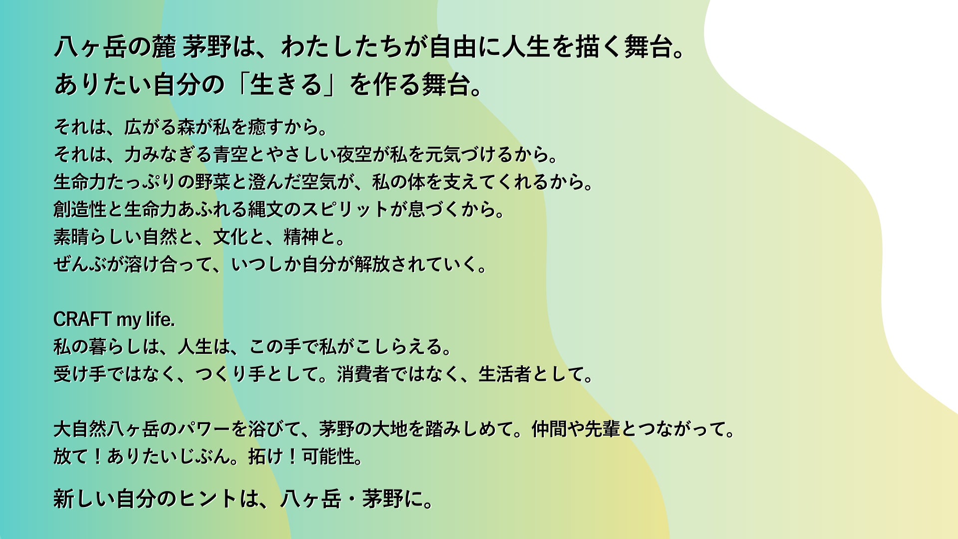 八ヶ岳連峰の裾野に広がる長野県茅野市は、リゾート地として知られる蓼科をはじめ、白樺湖、蓼科湖、車山など高原の自然を満喫できる観光資源に恵まれています。しかし、八ヶ岳が持つ多様な魅力は「観光地」としての知名度がある一方で、「茅野市」と「八ヶ岳のある暮らし」は認知されておらず、減っていく人口に対する移住施策や、茅野市が地域創生総合戦略に掲げる「若者に選ばれるまち」というスローガン達成への課題があります。