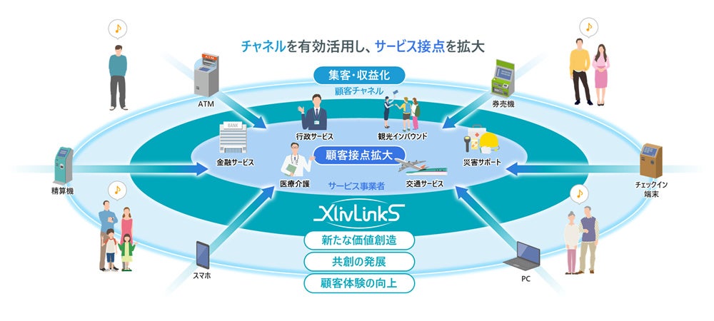 OKIは、これまでATMなどの端末、ネットワーク機器の提供や監視、ネットワーク構築を通じ、多種多様な業態におけるサービス拡大や業務効率化を支援してきました。これらの知見と強みを活かした「XlivLinkS」は、「いつもの場所が、あらゆるサービスへの入口に」というコンセプトで、世代問わずに誰もが普段使い慣れた環境やデバイスを通じて、それぞれのサービスにアクセス可能なサービス連携プラットフォームです。