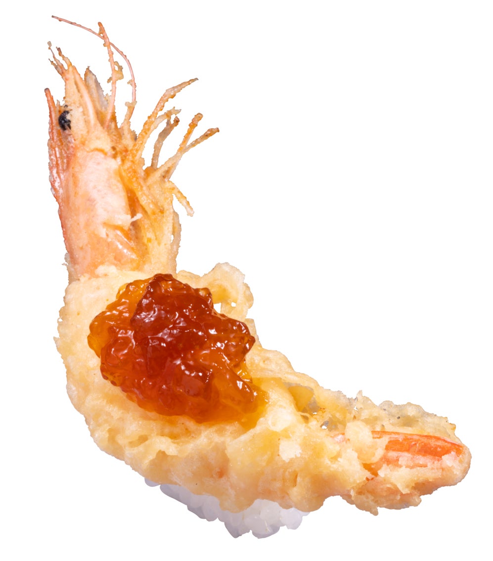頭から尻尾まで殻ごとお召上がりいただける柔らかさが特徴で、環境に優しいサステナブル商品でもある陸上養殖のえび「幸えび」を使用したにぎりです。今回、殻ごと1尾天ぷらにし、塩をかけてにぎりで仕上げました。殻ごと揚げることで、殻の香ばしさが加わり、えびの風味を一層感じていただけます。