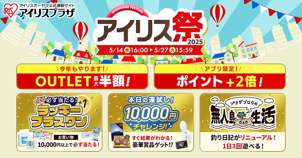 アイリスオーヤマ株式会社(本社:宮城県仙台市、代表取締役社長:大山 晃弘)は、今年のアイリス祭(※2)を、公式通販サイト「アイリスプラザ」上で5月14日(水)16時より開催します。