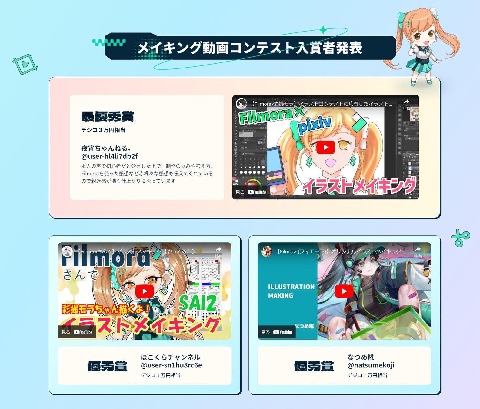 【応募作品 250点以上】 [ イラストメイキング動画コンテスト ] と [ Filmora × pixiv イラストコンテスト ] の受賞作品14点が発表されました。