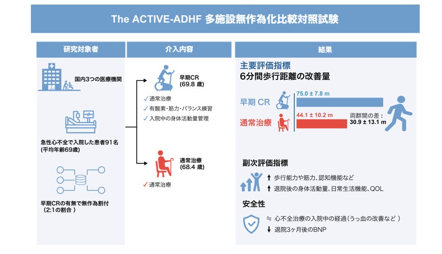 本研究(ACTIVE-ADHF)は、北里大学病院、北里大学メディカルセンター、亀田総合病院の3施設で実施され、91名のADHF患者を対象に、入院早期(中央値2日)から運動療法を基盤とするCRを導入した介入群と通常治療群を比較しました。主要評価項目である6分間歩行距離(6MWD)【※4】の退院時変化は、介入群で平均75.0m、対照群で44.1mと、両群間に30.9mの有意差が認められました(95%CI: 4.8–57.0, P=0.021)。さらに、副次評価項目として、認知機能やQOL、歩行自己効力感(歩くことに対する自信)、退院後の日常生活や身体活動量なども改善が見られ、臨床的な意義のある効果が確認されました。