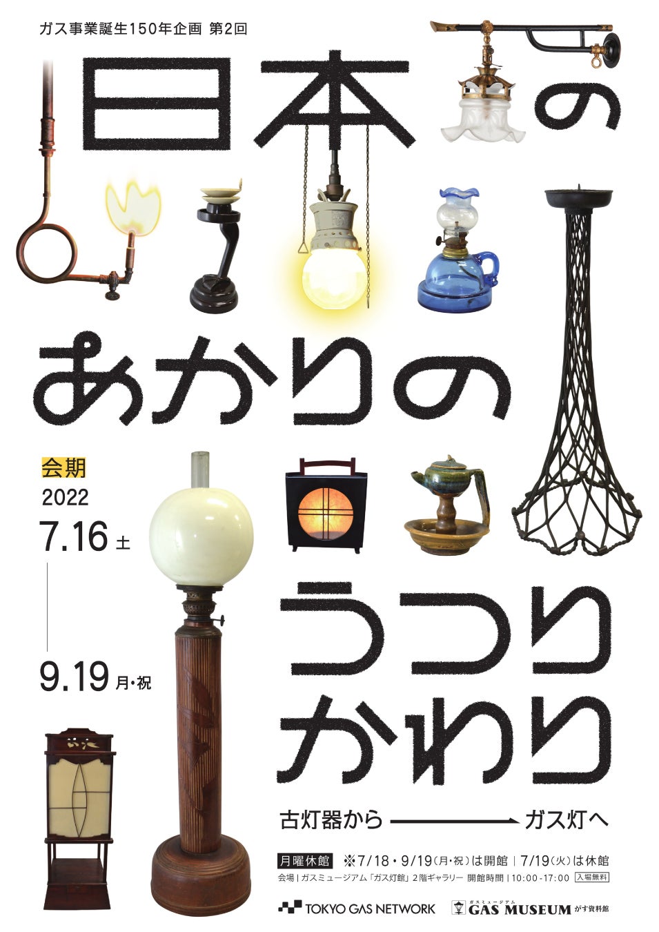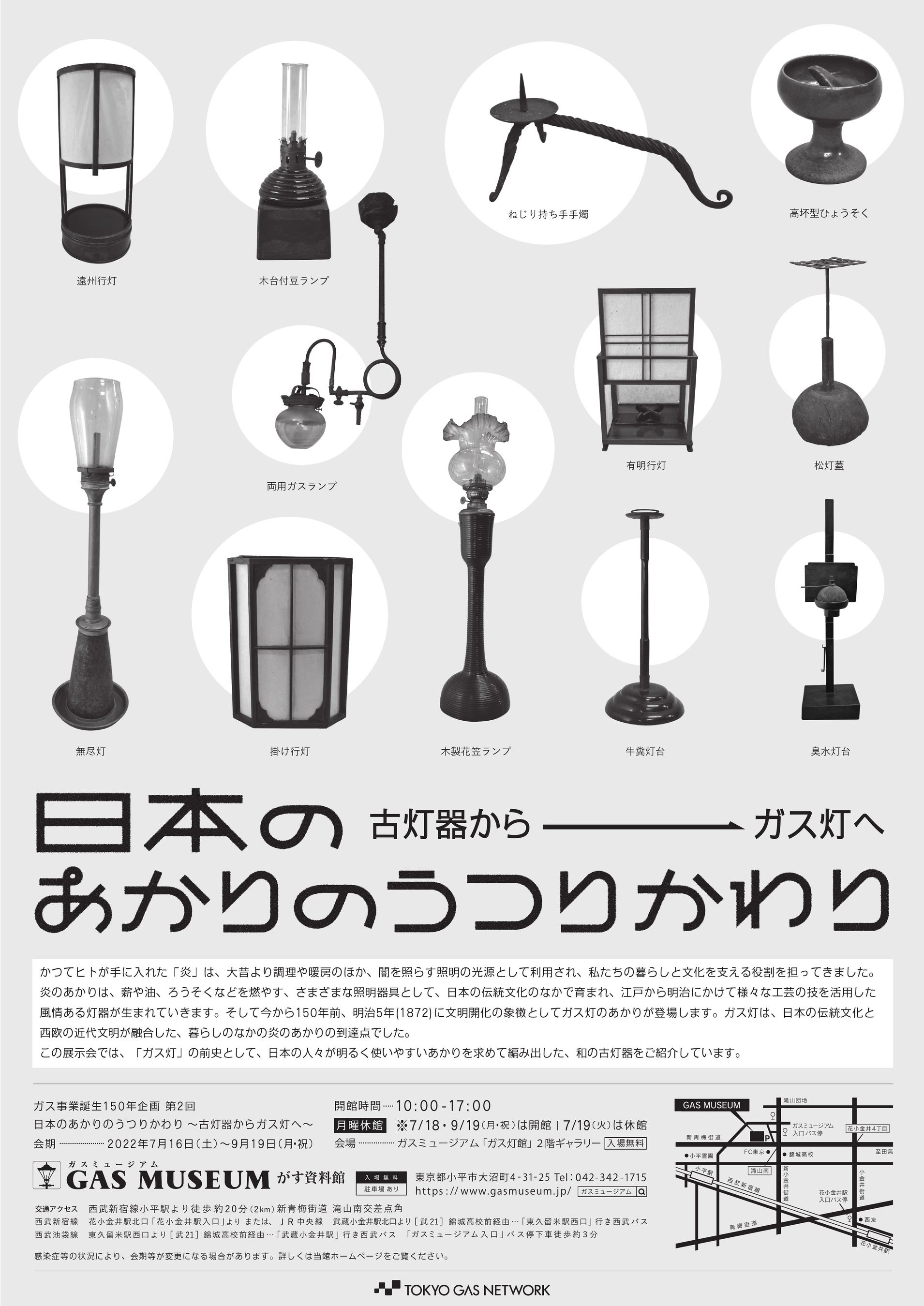 東京ガスネットワーク株式会社(以下「東京ガスネットワーク」)は、ガス事業誕生150年を記念し、2022年7月16日(土)から9月19日(月・祝)まで【「日本のあかりのうつりかわり」~古灯器からガス灯へ~展】を開催します。