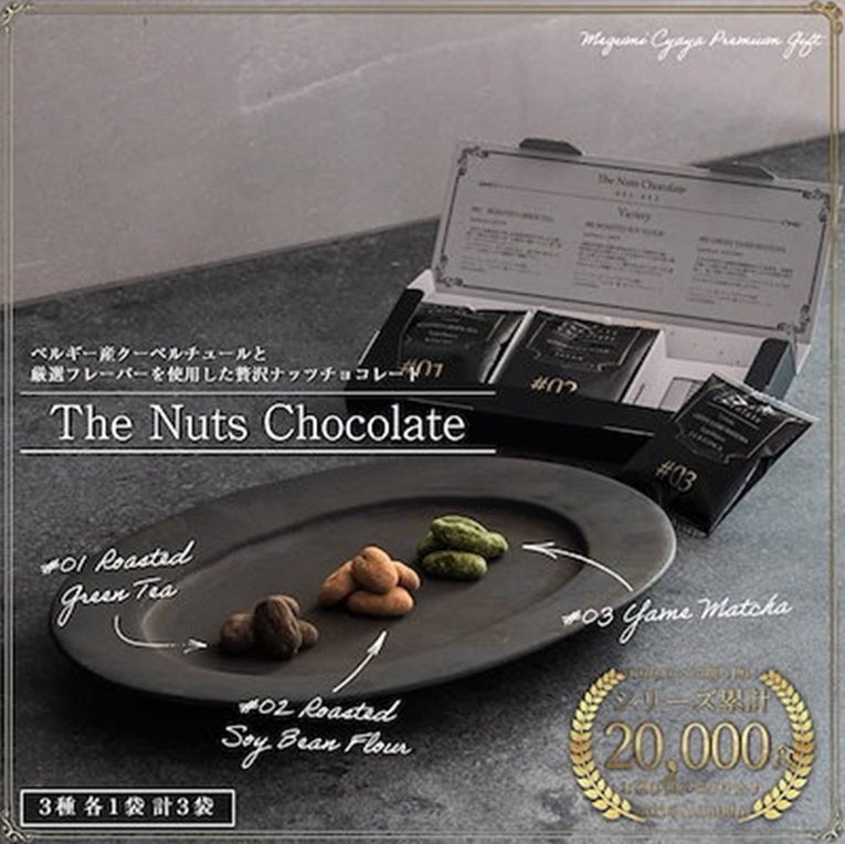 ベルギー産クーベルチュールと厳選フレーバーで仕立てた贅沢ナッツチョコレート。焙じ茶、きなこ、八女抹茶の和風フレーバー。