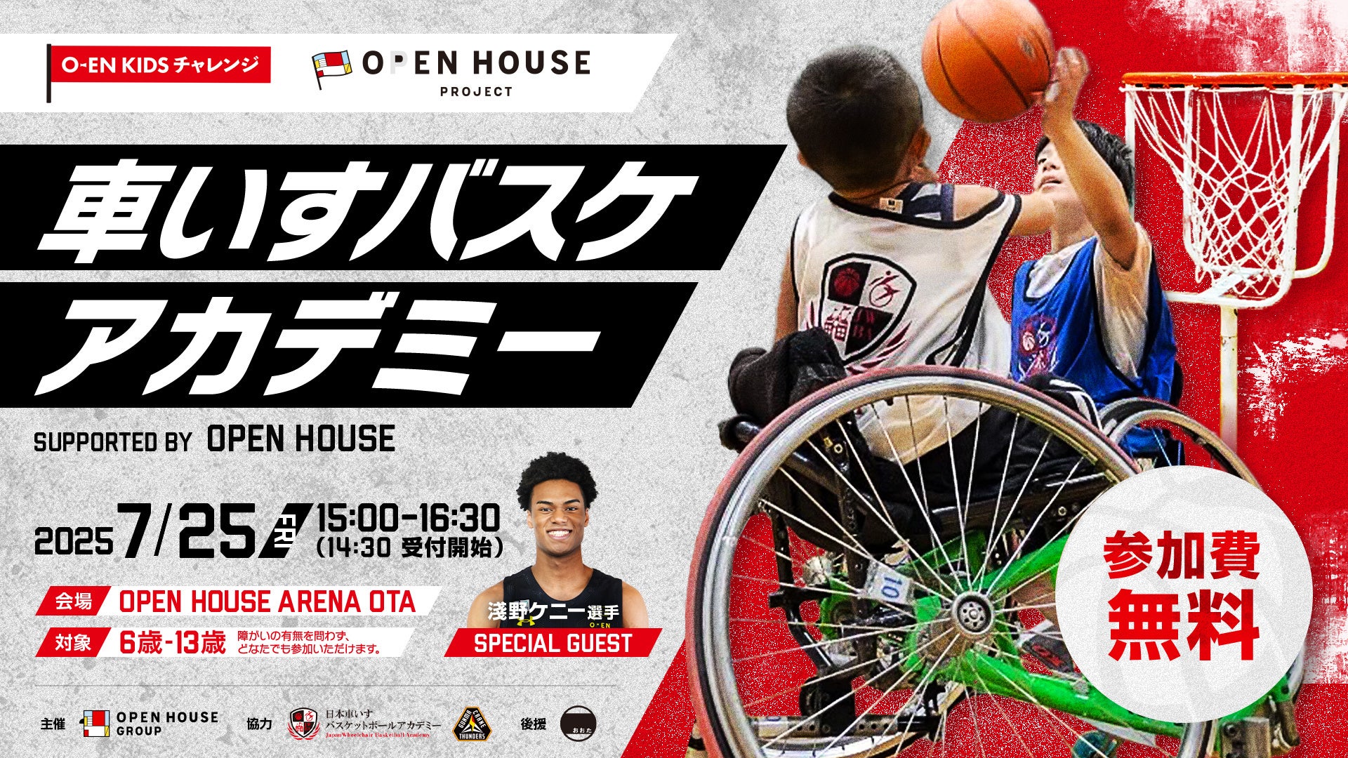 株式会社オープンハウスグループ(本社 東京都千代田区、代表取締役社長 荒井正昭、以下「当社」)は、「挑戦する人や組織を応援する」という当社の企業姿勢を体現する「O-EN HOUSE PROJECT」の一環として、2025年7月25日(金)に、「O-EN KIDS チャレンジ 車いすバスケアカデミー supported by OPEN HOUSE」をオープンハウスアリーナ太田(群馬県太田市飯塚町1059-1)にて開催することを決定し、参加者を募集いたします。