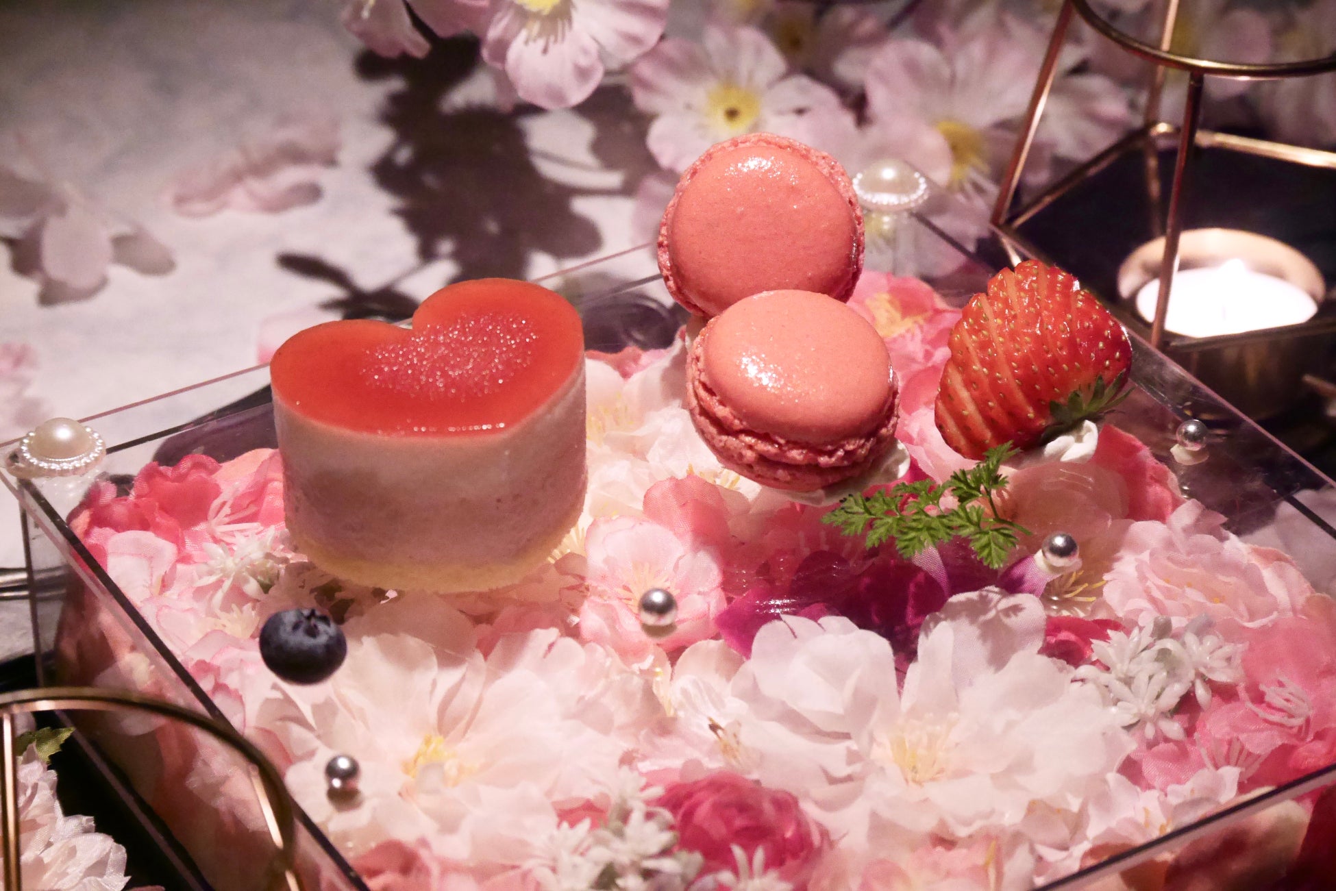 【デザート】桜のフラワーBOX 苺のハートケーキとマカロンの盛り合わせ
