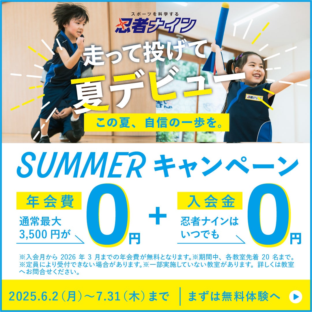 夏の新規入会キャンペーン実施中!今だけ年会費0円でお子さまの忍者ナインデビューを応援。猛暑のなかでも安心安全にお子さまの運動習慣を維持し、スポーツ科学の力で運動能力を引き出す