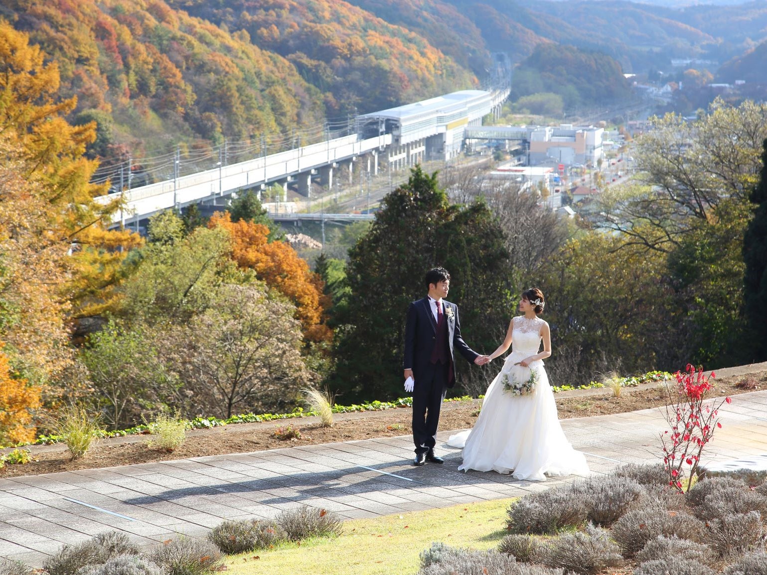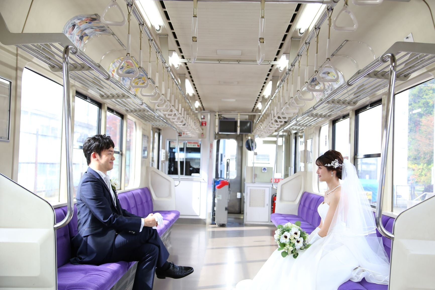 同プランは貸切車両内での人前結婚式ほか、洋装プラン・和装プラン、それぞれの衣裳に合わせたおすすめスポットでのロケーション撮影も含まれます。鉄道が好きなおふたりはもちろん、オリジナリティあふれる結婚式をしたいというおふたりにもぴったりの特別プランです。
