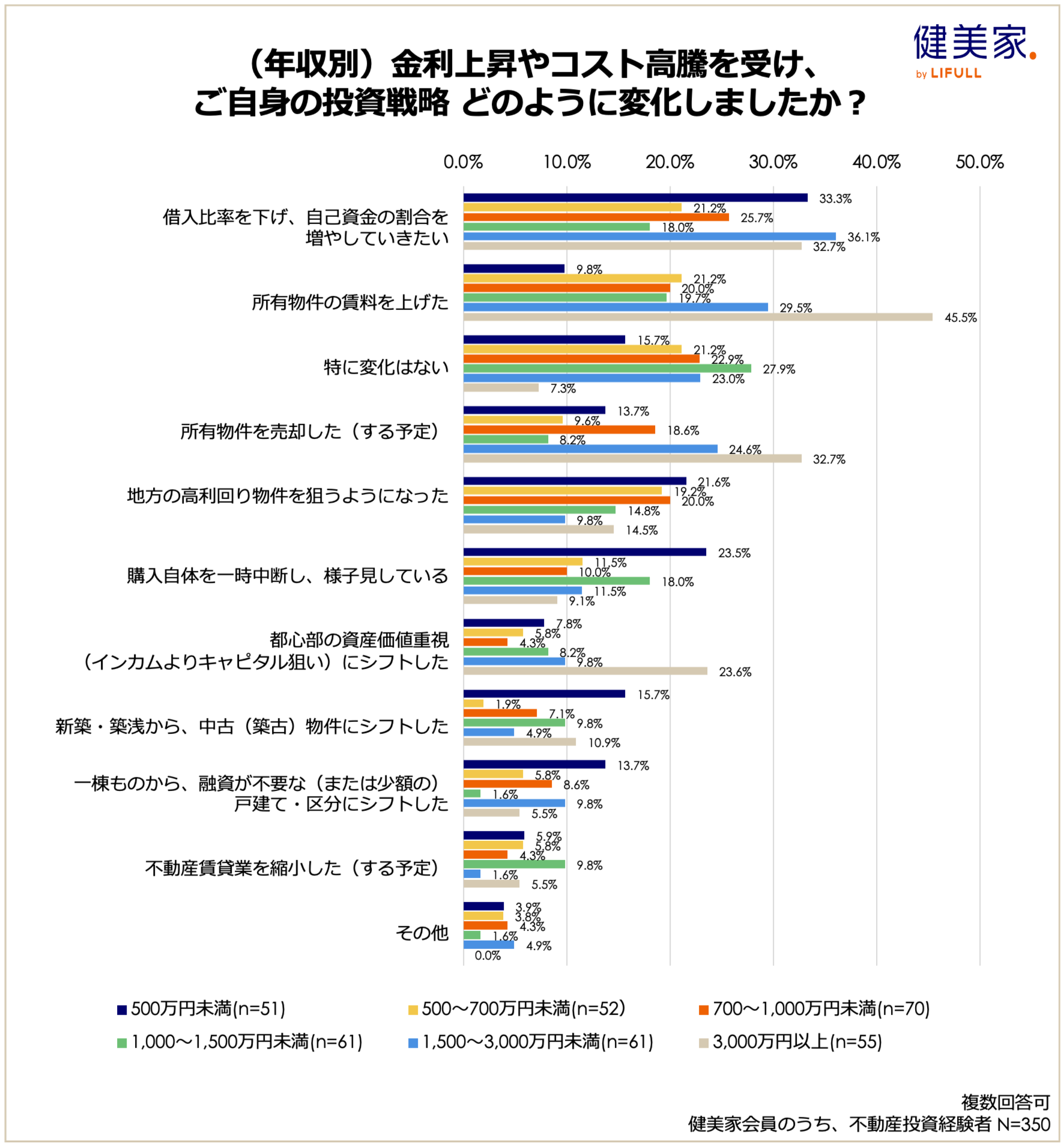 年収3,000万円以上では、「所有物件の賃料を上げた」が45.5%と約半数、「借入比率を下げ、自己資金の割合を増やしていきたい」が32.7%、「所有物件を売却した(する予定)」が32.7%といずれも全体より高い水準でした。さらに、「都心部の資産価値重視(インカムよりキャピタル狙い)にシフトした」が23.6%と、他の年収帯(4.3〜9.8%)と比べて突出しており、都心部の資産性重視の物件に戦略的にシフトしている層であることがわかります。「特に変化はない」は7.3%にとどまることから、いずれかの戦略変更をおこなっている投資家が多い層といえます。