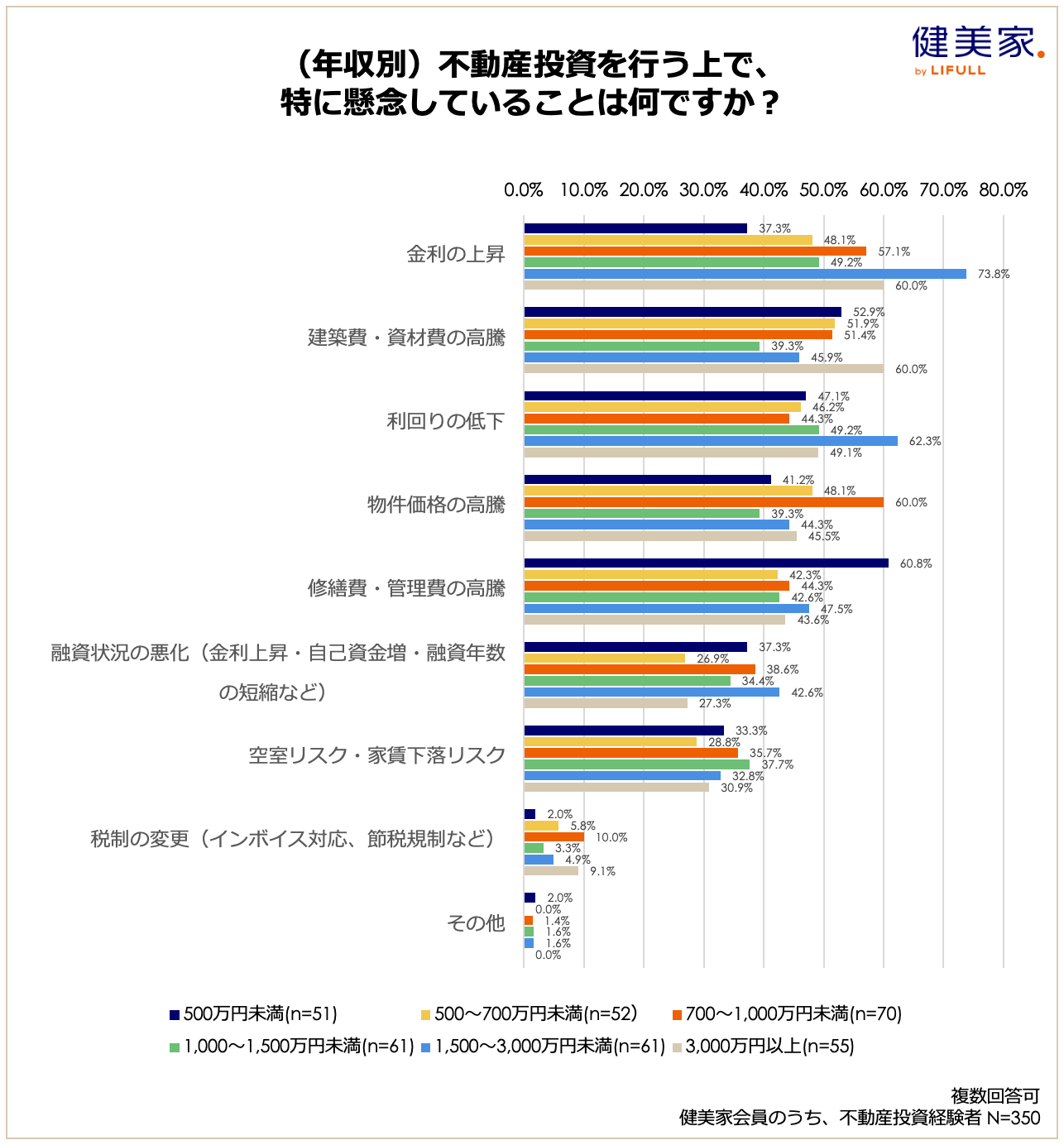 不動産投資上の懸念事項:年収500万円未満では「修繕費・管理費の高騰」(60.8%)がもっとも高く、「金利の上昇」(37.3%)は全体より低い。年収700〜1,000万円未満では「物件価格の高騰」(60.0%)が最大。