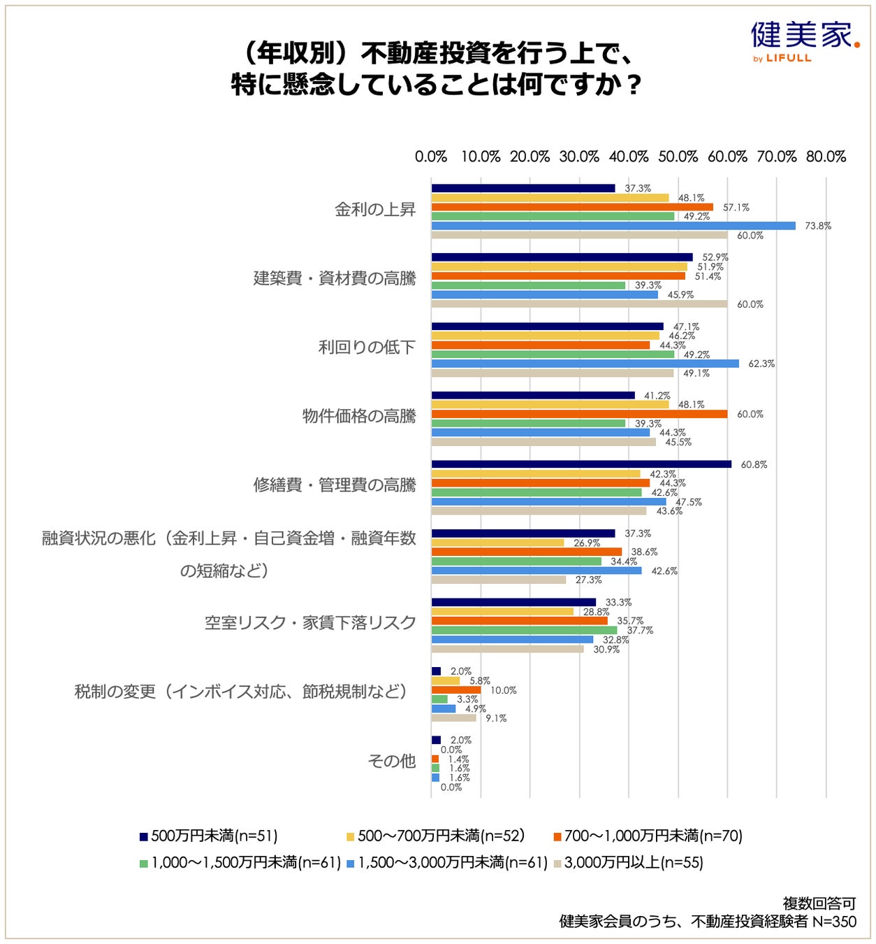 不動産投資上の懸念事項:年収1,500〜3,000万円未満では「金利の上昇」(73.8%)、「利回りの低下」(62.3%)、「融資状況の悪化」(42.6%)と、金融条件への懸念が中心。