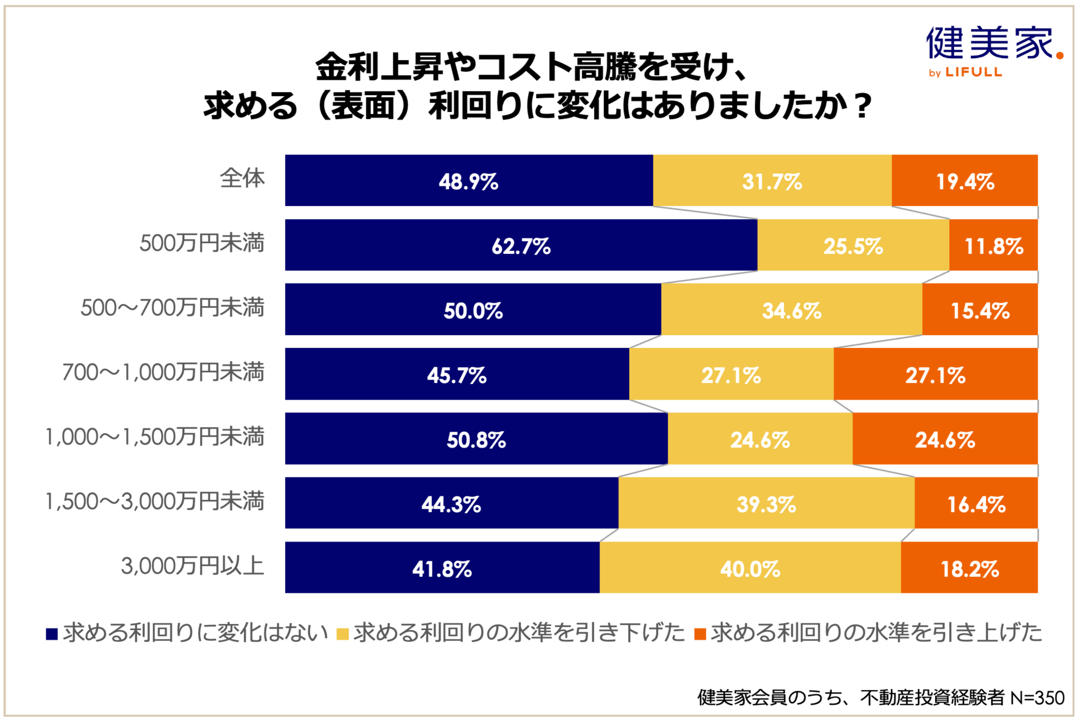 求める利回り:年収1,500万円以上では「引き下げた」がいずれも約4割(1,500〜3,000万円未満39.3%、3,000万円以上40.0%)。