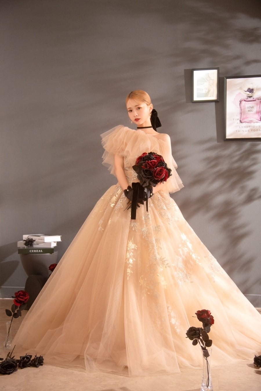 女性らしいこちらのドレスに今回はインパクトをプラス。