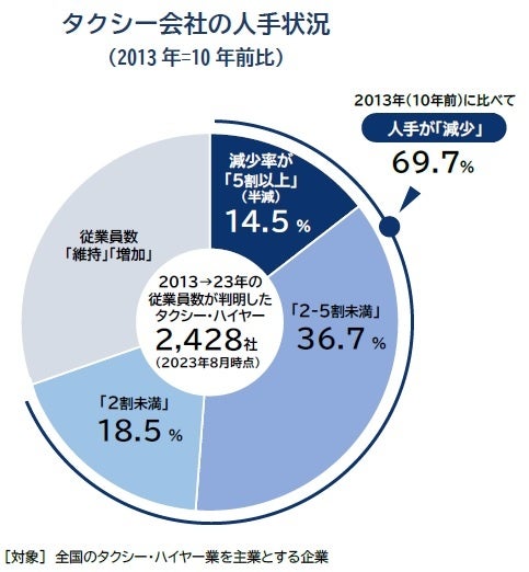 タクシーの現場でドライバー不足が深刻化してきた。国内でタクシー・ハイヤー事業を展開する企業で、ドライバーを含めた従業員数の推移を調査した結果、10年前の2013年時点に比べ、対象2428社のうち69.7%にあたる1691社で「減少」した。このうち、13年からの減少率が「5割以上」となった企業は14.5%・352社にのぼり、タクシー会社の1割超で従業員数が10年前から半数以下に減少した。