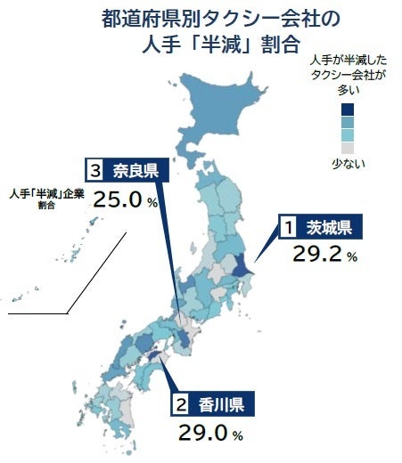 従業員数が「半減」となったタクシー会社の割合を都道府県別(本社所在地)にみると、最も割合が高かったのは「茨城県」で29.2%を占めた。「香川県」(29.0%)や「奈良県」(25.0%)など、地方を拠点とするタクシー会社で従業員数が10年前から半減している企業が多い一方、埼玉県や大阪府など需要の大きい都市部でも、従業員数が大幅に減少した企業が多かった。