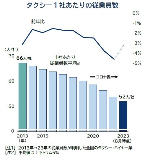 タクシー会社の1社あたり従業員数の推移をみると、2013年は平均で66人/社の水準だったものの、以降は漸減傾向で推移し、23年8月時点では52人/社に減少し、10年前から約2割減少した。特に、コロナ禍でタクシーの売り上げが大きく落ち込んだ20~22年にかけて、前年からの減少率が拡大するなど、大幅な従業員数の低下がみられた。