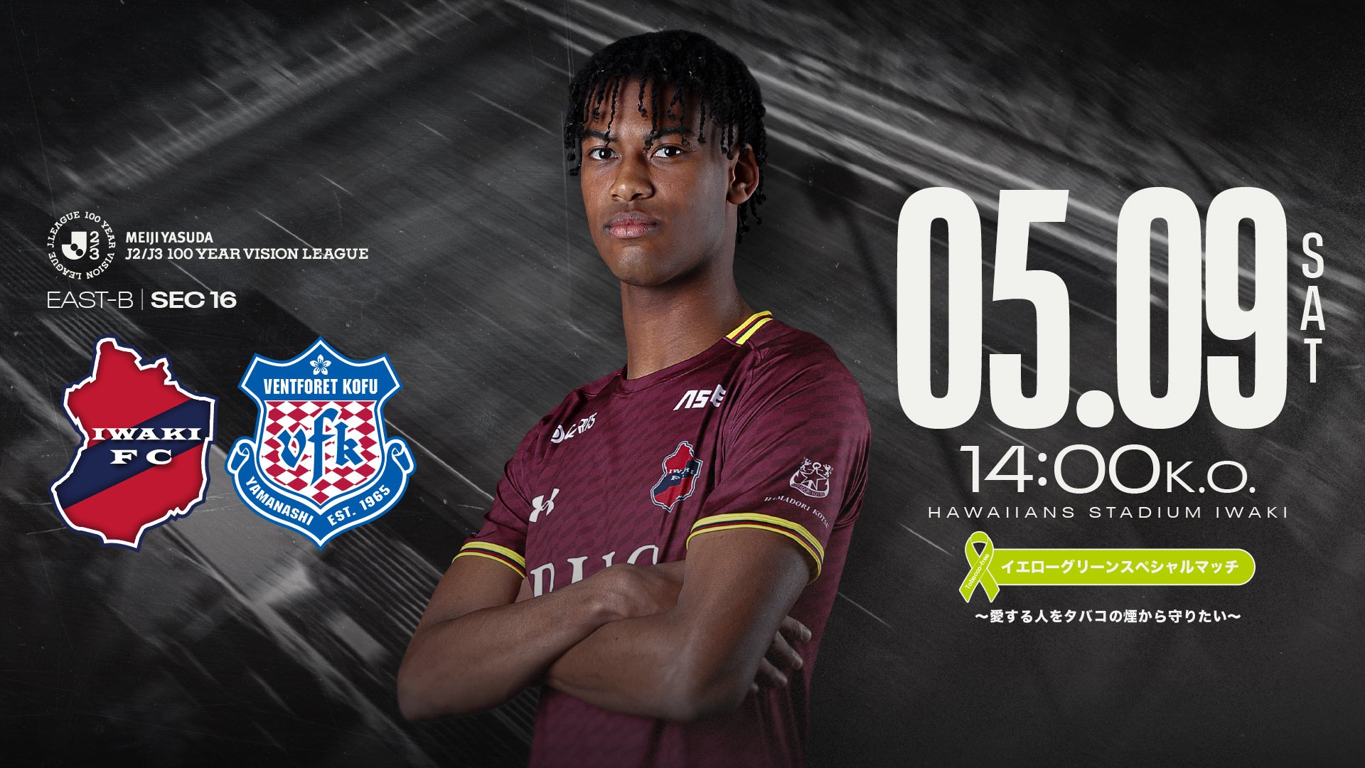 このたび、いわきFCは、5月9日(土)に開催される明治安田J2・J3百年構想リーグ 地域リーグラウンド EAST-B 第16節 ヴァンフォーレ甲府戦を「イエローグリーンスペシャルマッチ〜愛する人をタバコの煙から守りたい〜」として開催いたしますので、お知らせします。