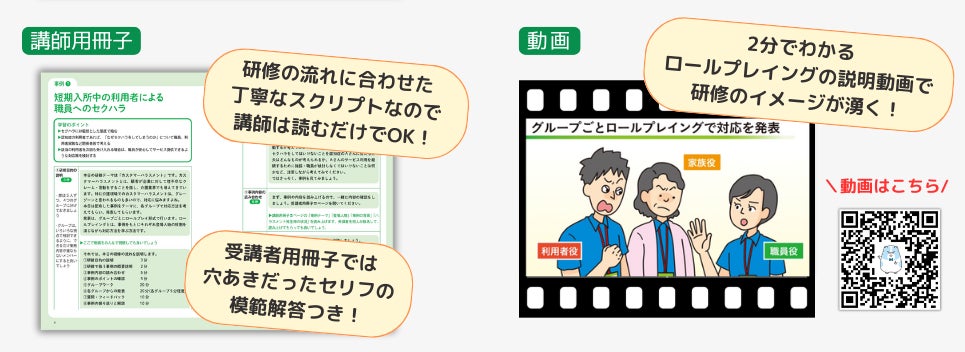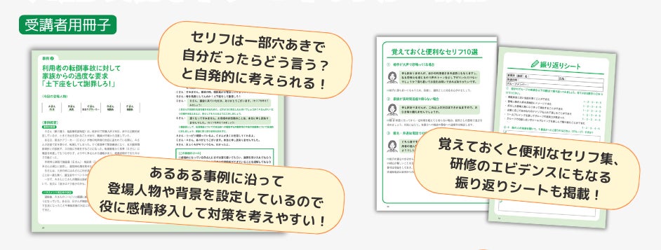 介護現場で起こりえる事例について、「受講者用冊子」と「講師用冊子」を活用して研修が実施できます。