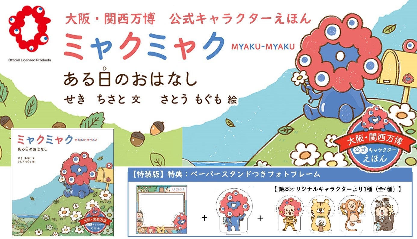 ※特典:ペーパースタンド付きフォトフレーム ペーパースタンドの絵柄は、1冊につき ミャクミャク+絵本オリジナルキャラクター1種(全4種)が入っています。